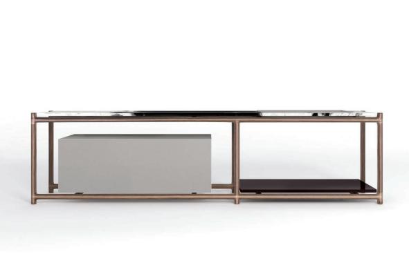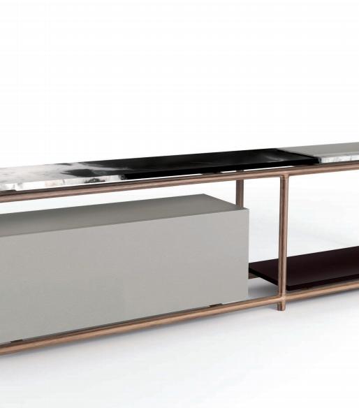 Low console, main structure in carved Canaletto walnut solid wood, cabinet in wood either lacquered or upholstered in leather, with basket drawer and metal handle. Internal structure lacquered in matt RAL colours. Marble top can be supplied with storage tray upholstered in leather or fabric.