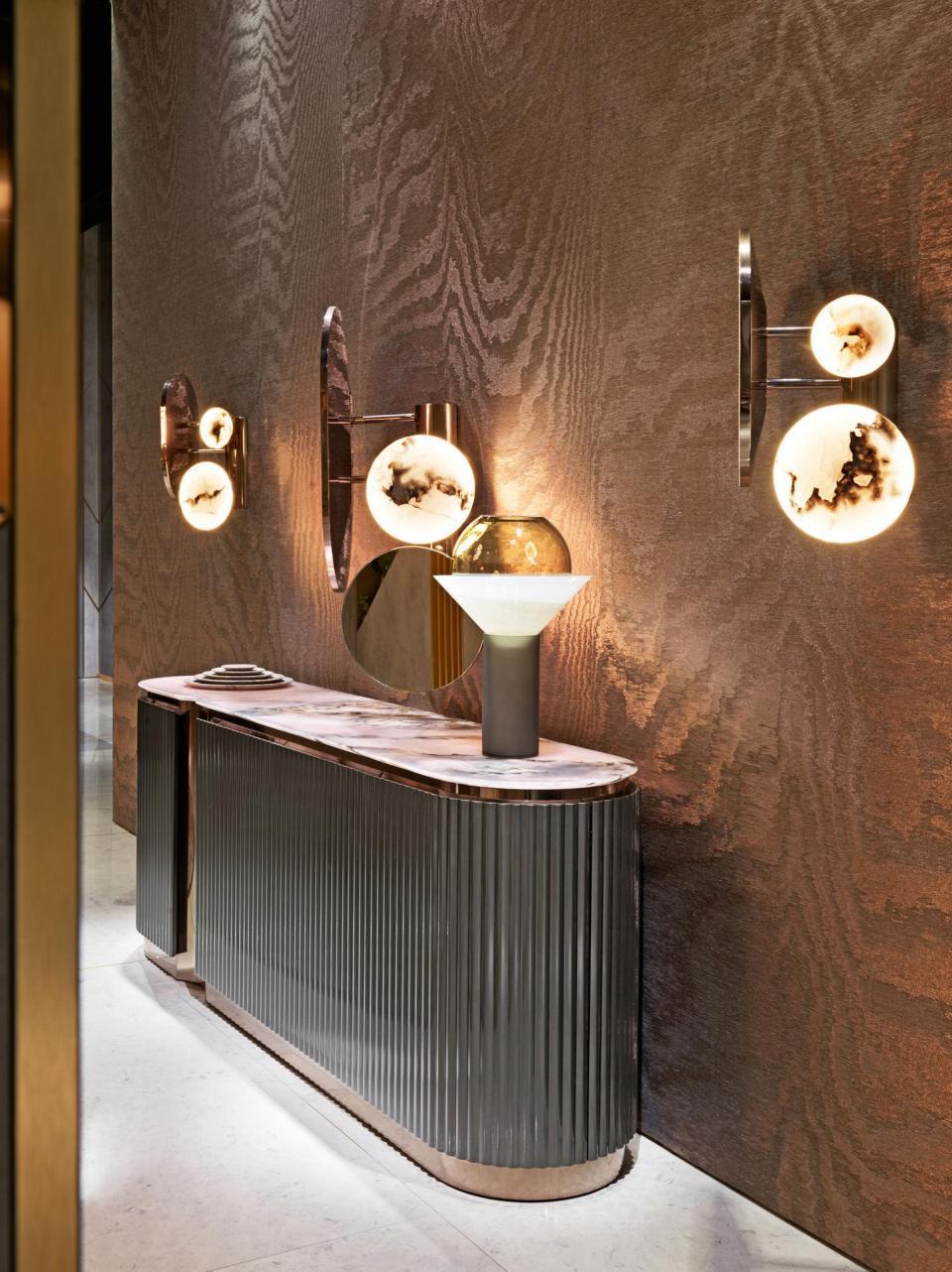 High unit with curved lateral sides; structure in wood with ribbed doors and sides, available either lacquered or upholstered in leather or fabric. Internal structure equipped with drawers lacquered in matt RAL colours. Base and decorative profiles in curved stainless steel. Marble top with bevelled profile.