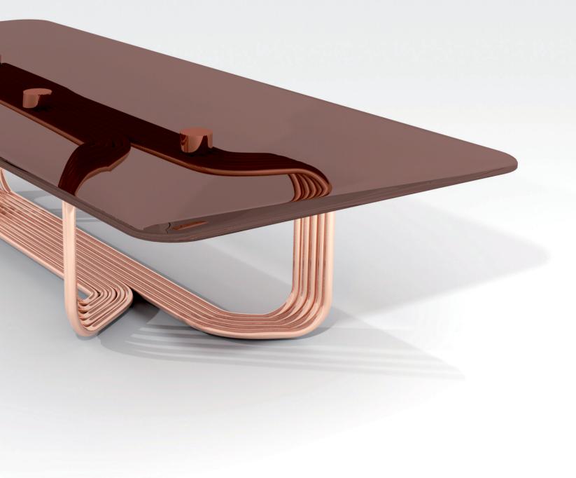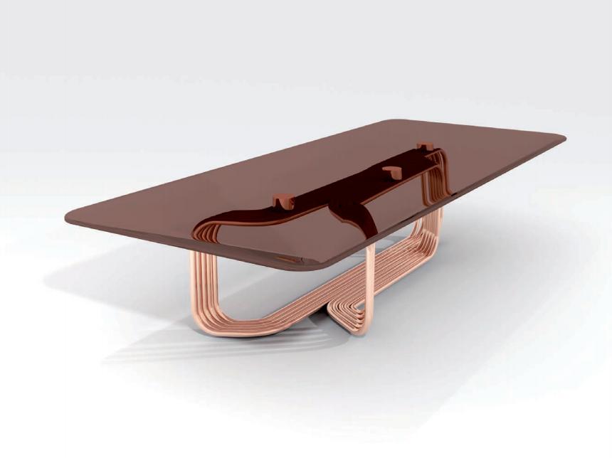 Console with metal tubular structure in chrome finish, suspended top in glass or marble.