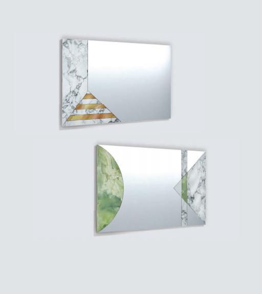 Mirror in marble and glass, frame in satinized stainless steel. Combination of marbles in different shapes and colours.