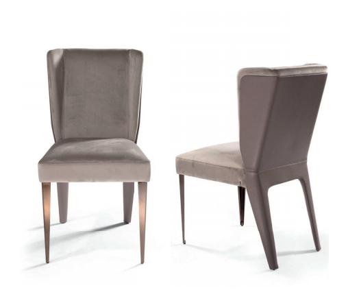 Upholstered chair with structure in wood. Seat and back padded and upholstered in leather or fabric. Rear back and rear legs upholstered in leather, front legs in stainless steel.