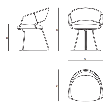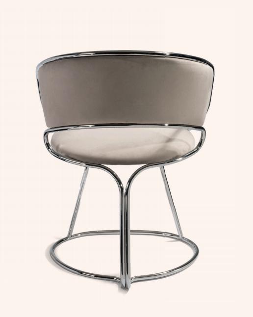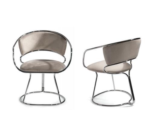 Chair in curved metal tube welded into one single piece, builtin padded seat and backrest upholstered in leather or fabric.