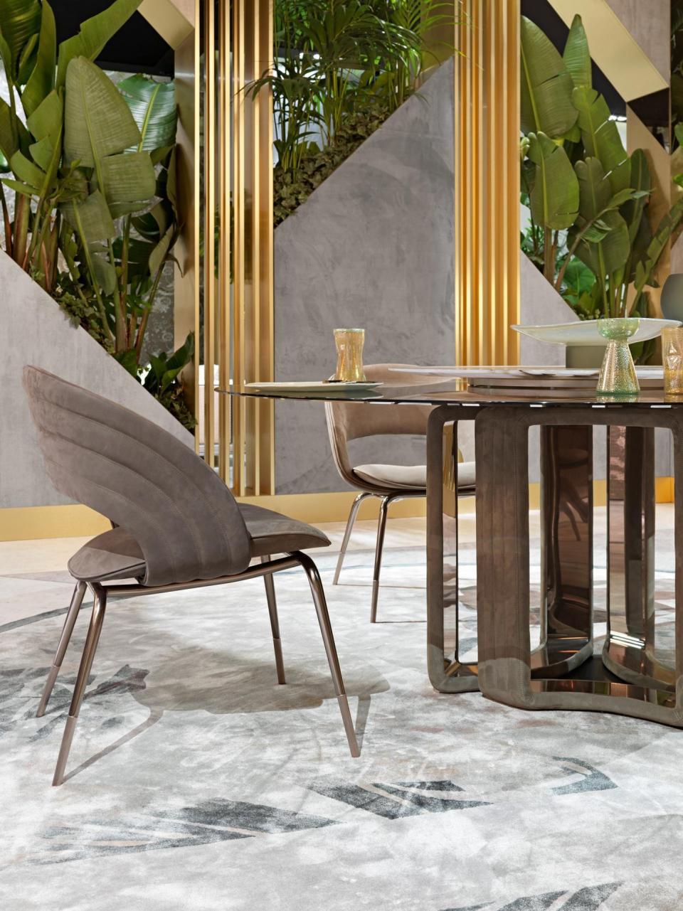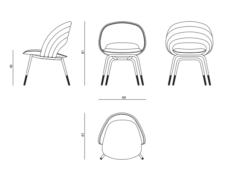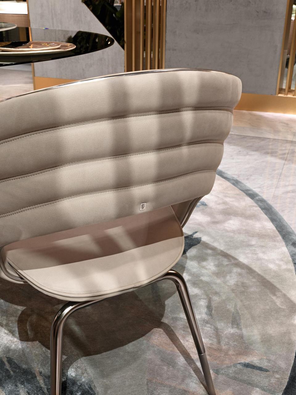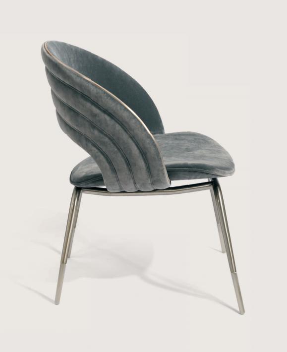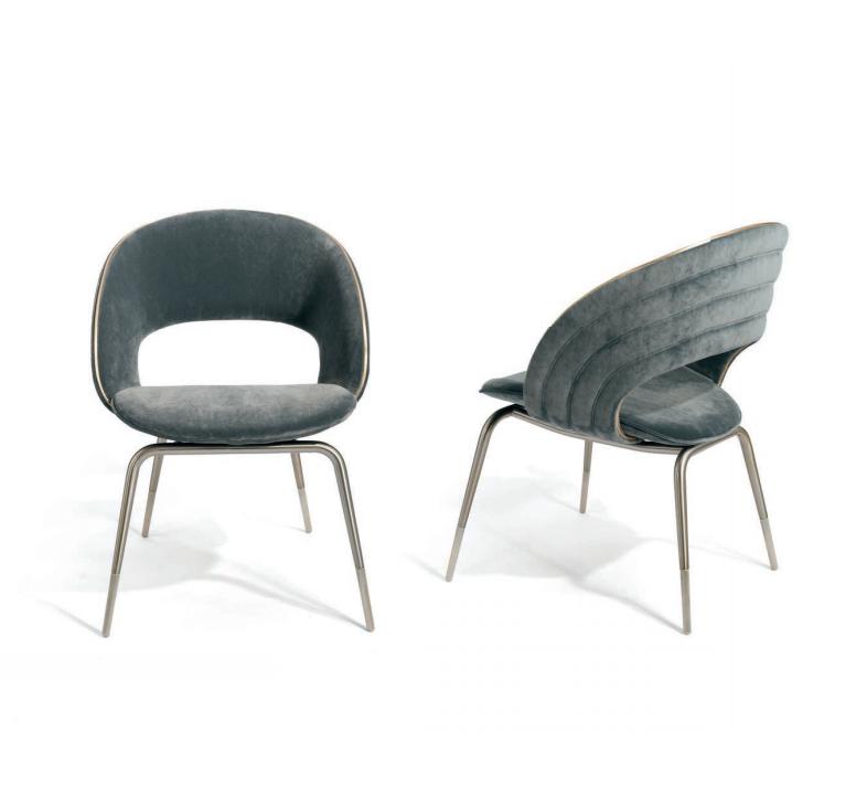 Chair in curved wood with tubular conic legs and turned feet. Quilted upholstery in leather or fabric, and metal inserts running along the backrest edge.