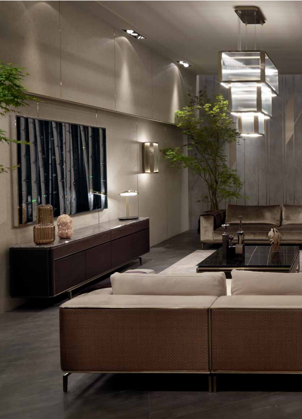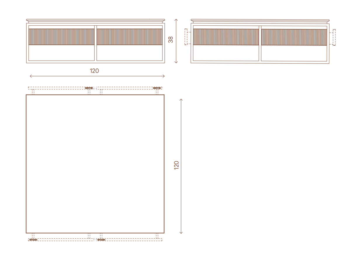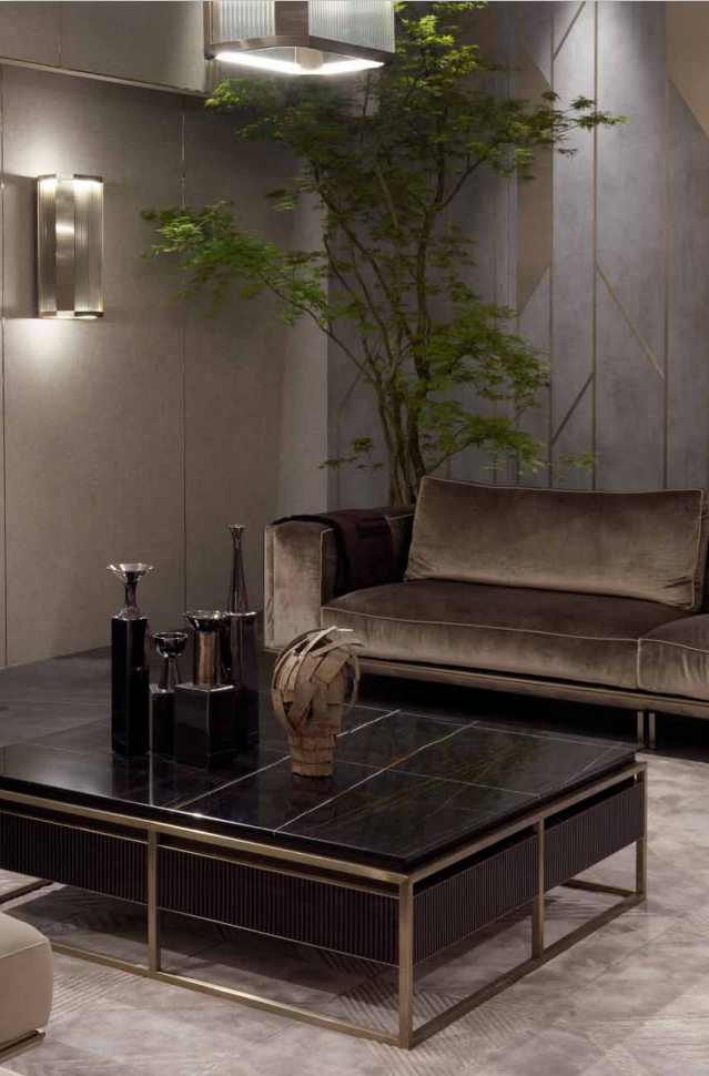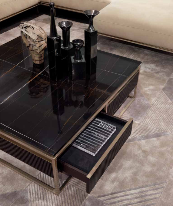Coffee table with 4 drawers in carved wood in low relief with vertical stripes design, marble top with negative machined profifile. Frame and decorative profifiles in brushed stainless steel. Drawers internally lined with microfifibre. The wooden parts are available in matt fifinishes B.180, B.181, B.182, C.001. Metal parts available in the satinized metal fifinishing selection.