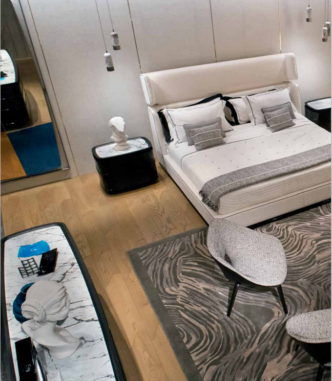 Bedside table with 2 drawers with semi-elliptical central body in curved wood on all sides, external surface with raised profifiles, glossy lacquered fifinish or covered in leather. Marble top inserted in a molded frame in solid Oak wood with black open-pore fifinish. Conical base in black wood and lower profifile in satin metal. Drawers interiors in black oak and black microfifibre inside.