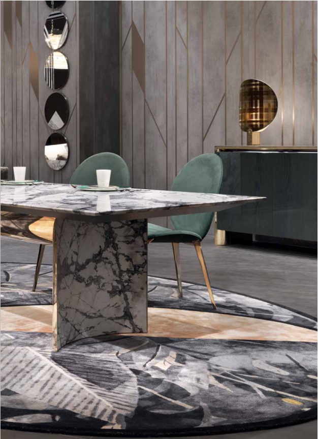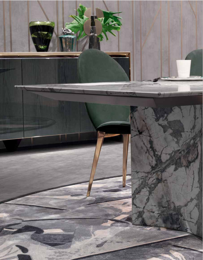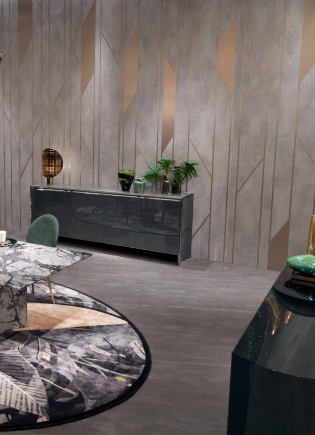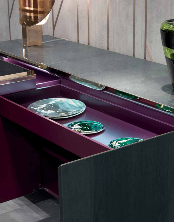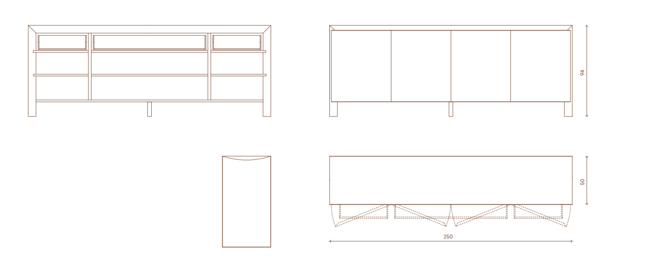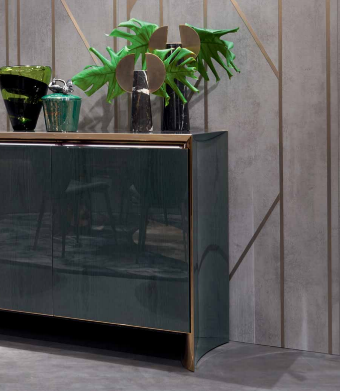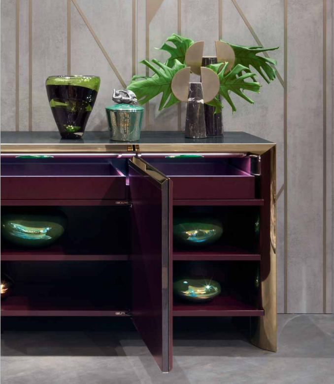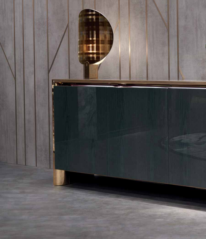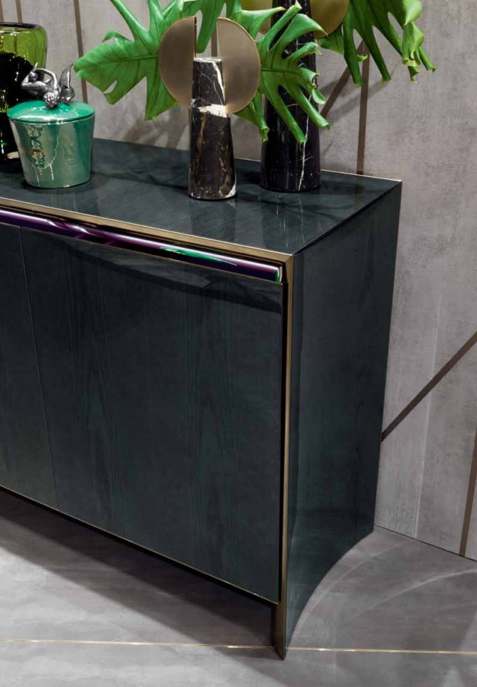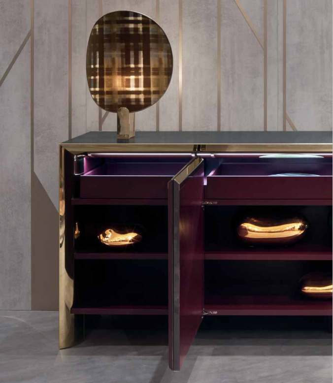 Cabinet with four doors, wooden frame with concave sides, veneered top and doors with 100 gloss handmade fifinishing. Internal frame of sides and top in polished stainless steel bent inwards. Interiors laquered in RAL colour with a matte fifinish, with visible internal drawers even with closed doors. Available with inside LED light under the top. Metal parts available in the metal fifinishing selection, wooden parts available in the veneer selection fifinishings