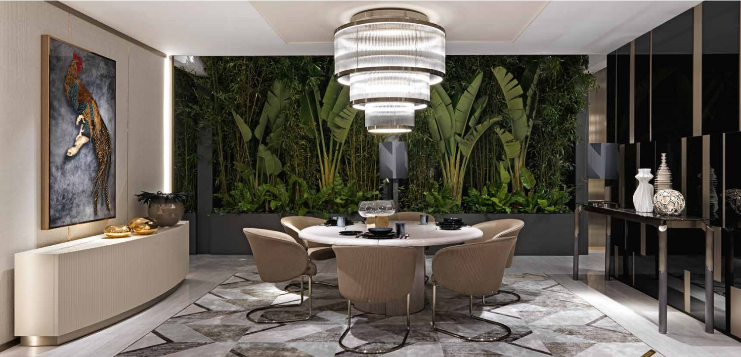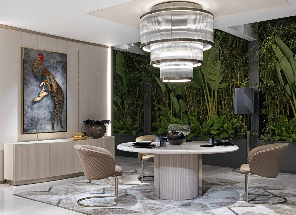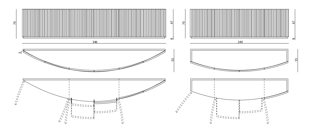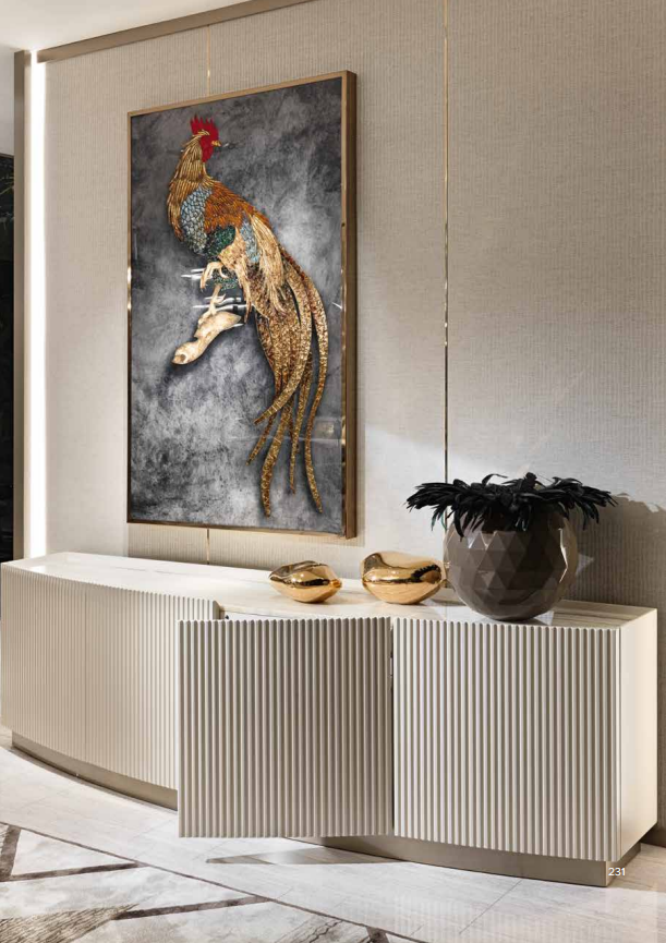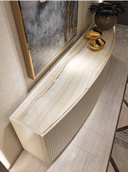 Curved cabinet with 6 - 4 doors. Structure in MDF with curved and pantograph-grooved doors. Mat lacquering. Built-in top in shaped marble th. mm 20 divided in 3 parts (in the version with 6 doors). Wooden base covered with shiny stainless steel laminate. 3 versions are available: - with 6 doors and 4 drawers placed inside the two central doors, with push-pull opening system. Each lateral space is provided with a shelf in transparent glass, with adjustable height. - with 4 doors and 4 drawers placed inside the two central doors, with push-pull opening system. Each lateral space is provided with a shelf in transparent glass, with adjustable height.