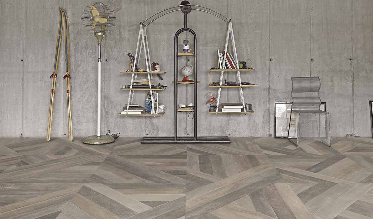 Tinto, Back and Essenze are the variants of the Emilgroup collection. Tinto is a distinctive type of stained wood in various shades of grey. Back is a sophisticated evocation of the underside of salvaged wood. The effect is that of a highly varied surface, with the tile sizes often indistinguishable within the laying pattern. Essenze mixes the woods from old planks of different origins and variegated colours. For original design schemes with a strong aesthetic personality, without sacrificing the technical qualities of porcelain stoneware. The series is completed by the 80x80 Tangram tile which interlocks, builds up and breaks down geometric forms, the basis for infinite installation layouts. Attractive, unconventional effects run across the surface, enriching the most innovative design schemes.