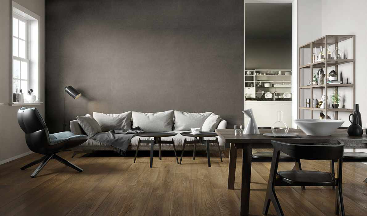 A dynamic, exclusive collection for interiors. Slate and wood, applied on walls and floors, give large interiors a striking architectural character; leather, used as a wall covering, delights lovers of avant-garde design. Also available in 20mm size.
