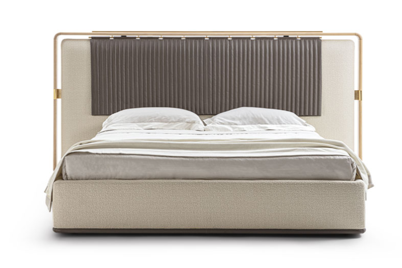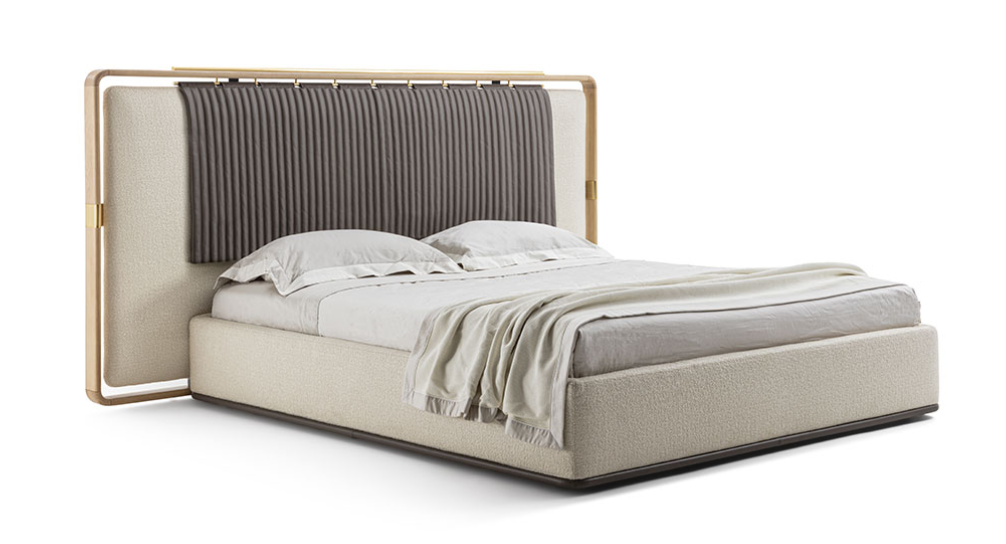 Linee rigorose e design contemporaneo sono i tratti distintivi del letto Lario, design by Andrea Bonini, grazie alla sua ricerca di eleganza senza tempo e massima cura dei dettagli. Il letto Lario è caratterizzato da un'alta testata con struttura esterna in legno, che incornicia un pannello imbottito rivestito in tessuto o pelle. Il pannello è sostenuto da dettagli metallici in oro e risulta sospeso come un quadro sullo sfondo. Nella versione Quilt, l’inserto sulla testata viene trapuntato verticalmente. La robusta e solida struttura del letto, arricchita da un'elegante base rivestita in pelle, offre un contrasto visivo ricercato con l'aerea testata per un approccio glamour di purezza estetica.