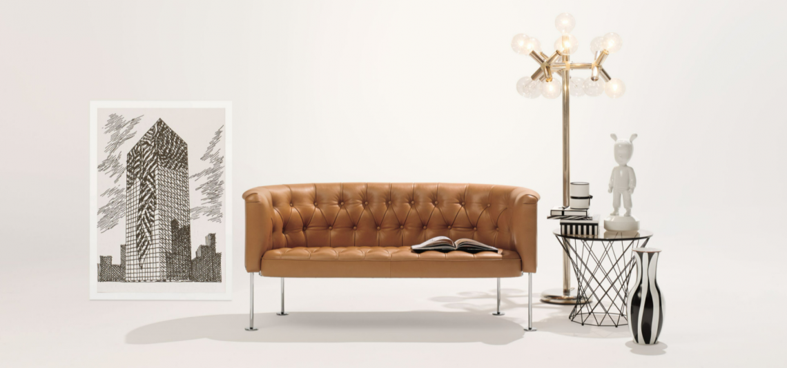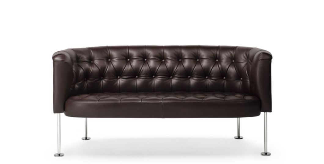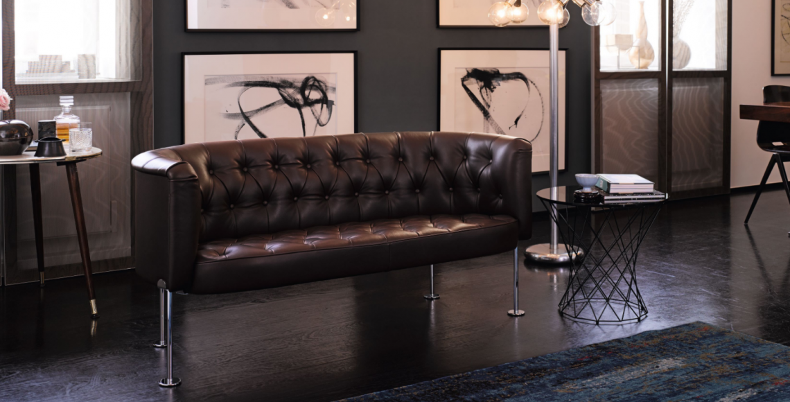 As with a piece of Chesterfield furniture, the characteristic diamond pattern gives structure to the seat and back. This is achieved by the traditional button upholstery technique. The delicate frame is an homage to the Bauhaus. Alone or with an armchair, this is a statement piece in lobbies and lounges.