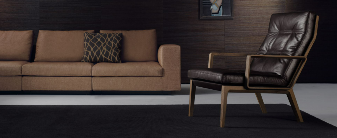 The lounge chair works in an exceptionally soft and intimate way: inviting upholstery, soft leather with stitched piping, elegant and inwardly contoured wood. Available with high or low back and an accompanying stool.