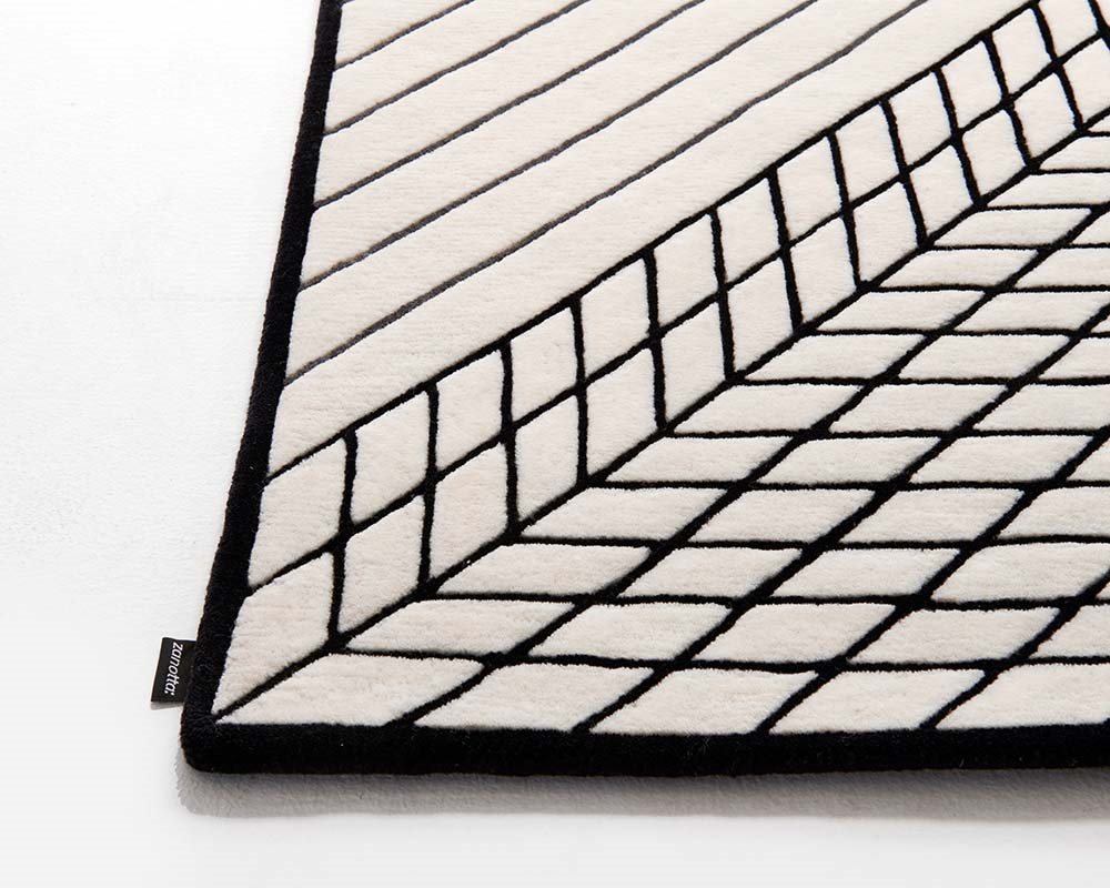 手制簇絨地毯,整個(gè)表面具有均勻絨毛,由 100% 新西蘭羊毛制成。地毯底層材料采用100%棉質(zhì)帆布制成,以 100% 天然乳膠固定。四周邊緣為純手工編織,六邊均采用羊毛紗線織就。具有為 200x300 和 250x350厘米版本可供選擇,均為統(tǒng)一顏色:底部為白色,點(diǎn)綴與原始設(shè)計(jì)呼應(yīng)的灰色與黑色線條。地毯的整體厚度約為 9 毫米,重量為 3.7 公斤/平方米。