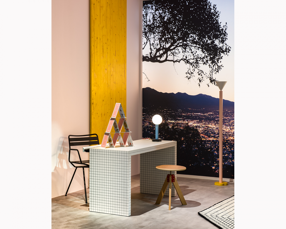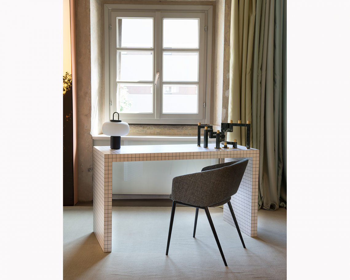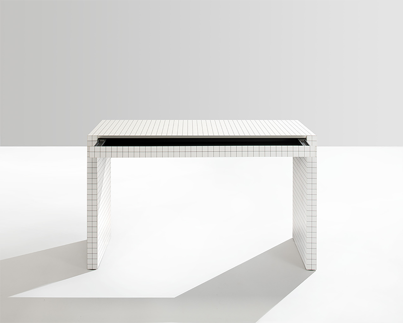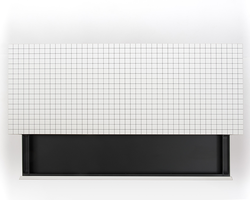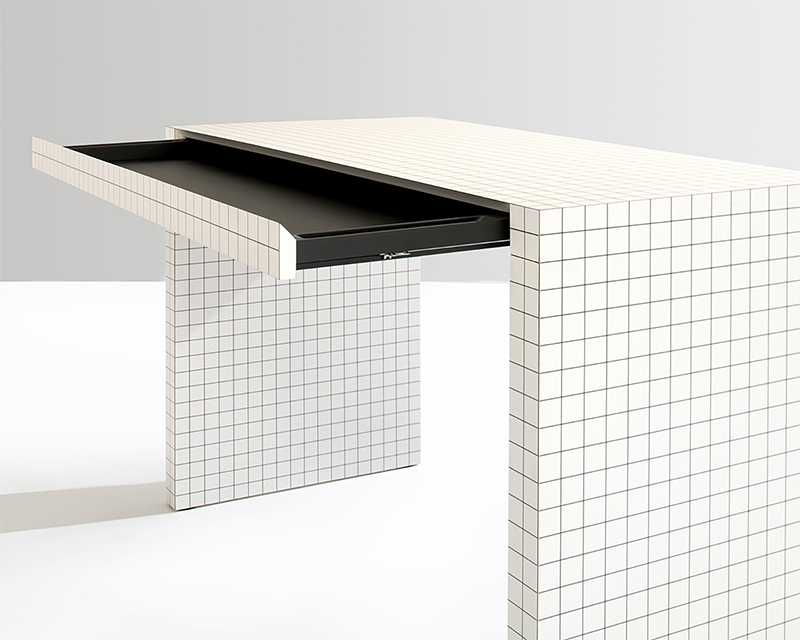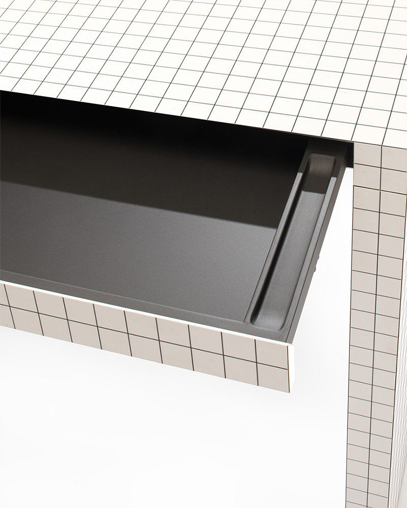 漆面層壓木結(jié)構(gòu),白色設(shè)計(jì),點(diǎn)綴軸距為 3 厘米的方格數(shù)碼印紋。可抽出式抽屜可隱藏于柜面下,抽屜隔間采用黑色防刮壓紋漆木制成。
