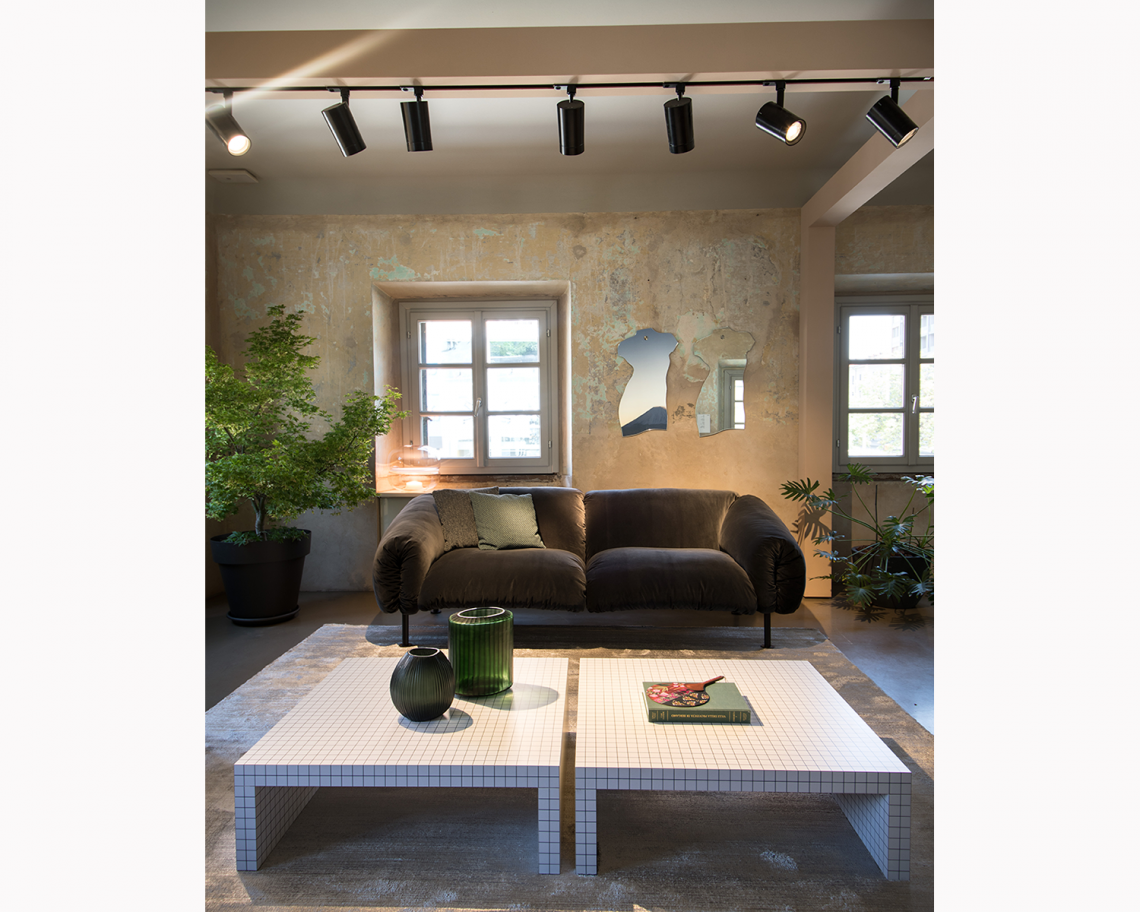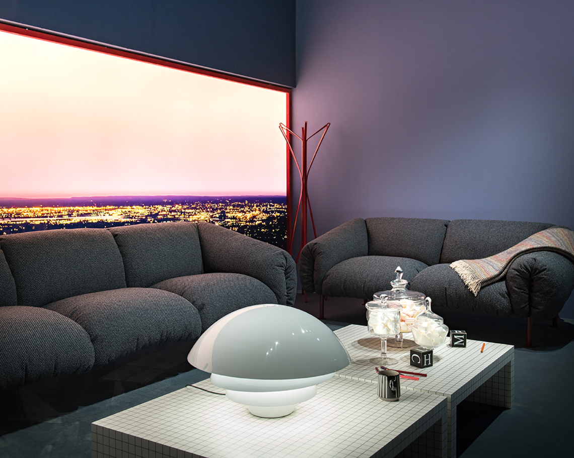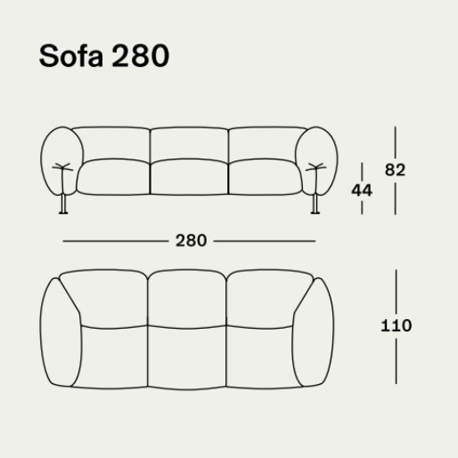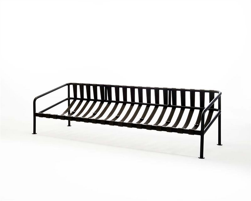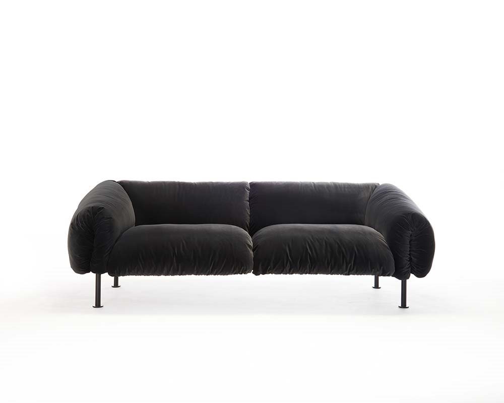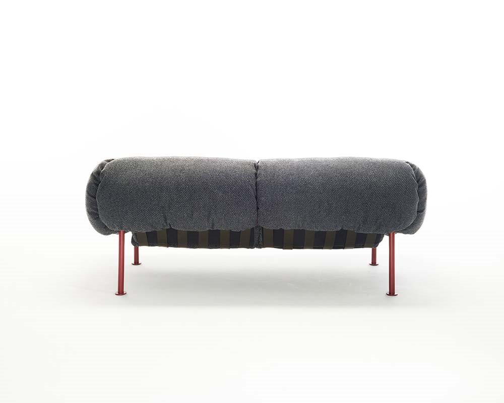 黑色或亞光紅色漆面鋼質支撐框架,配備支撐靠墊的煤黑色剛性聚酯帶。坐墊、靠墊和扶手墊均填充聚氨酯/再生和可再生聚酯球體??刹鹦秲纫r采用再生和可再生滌綸面料打造。設有無膠填充組件??刹鹦睹媪献o套。