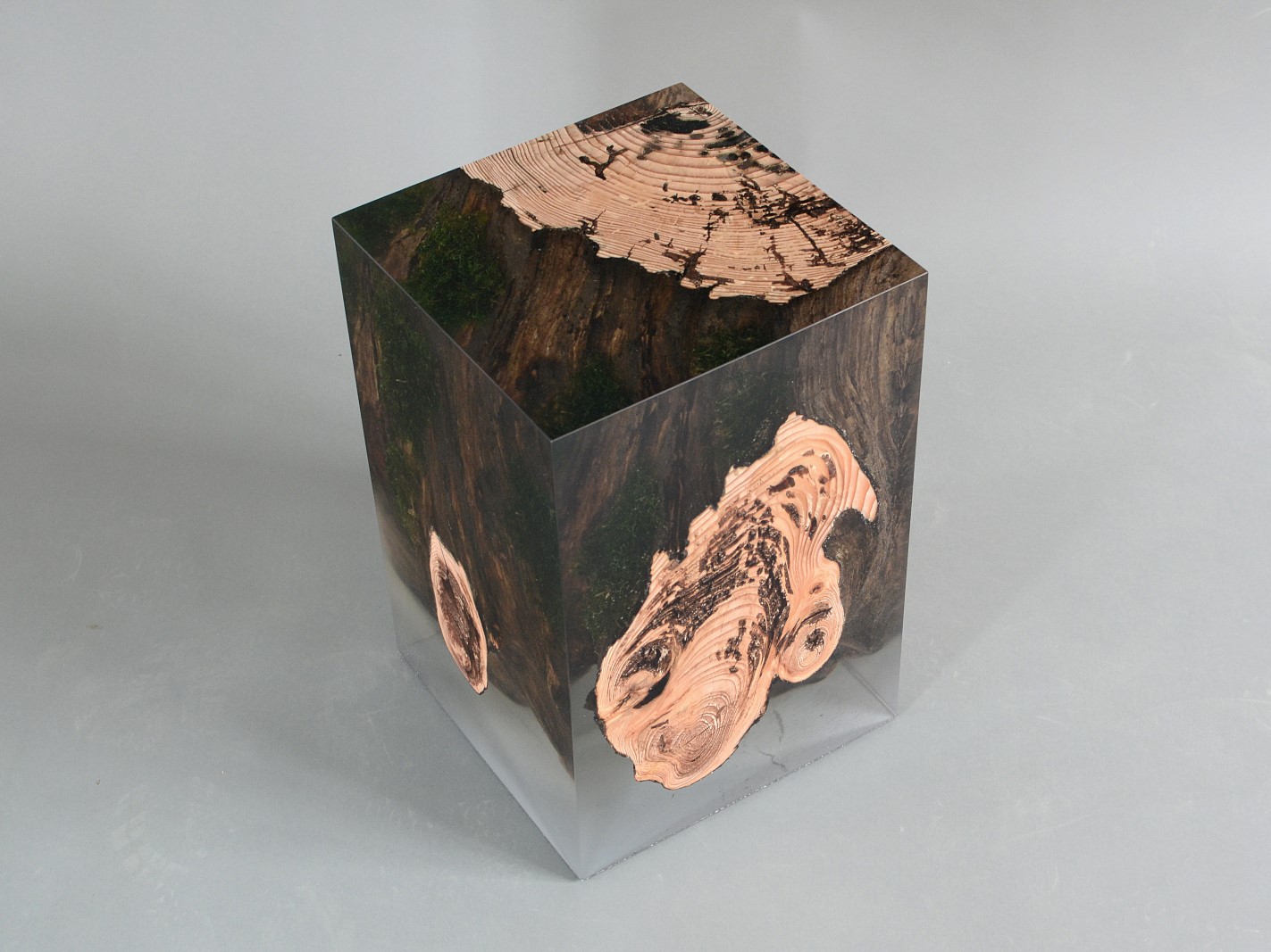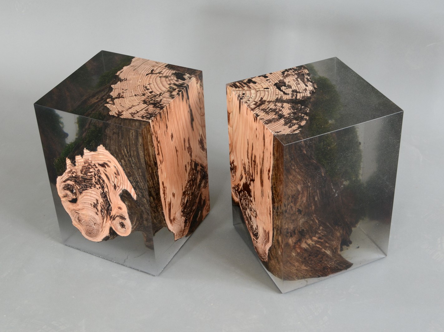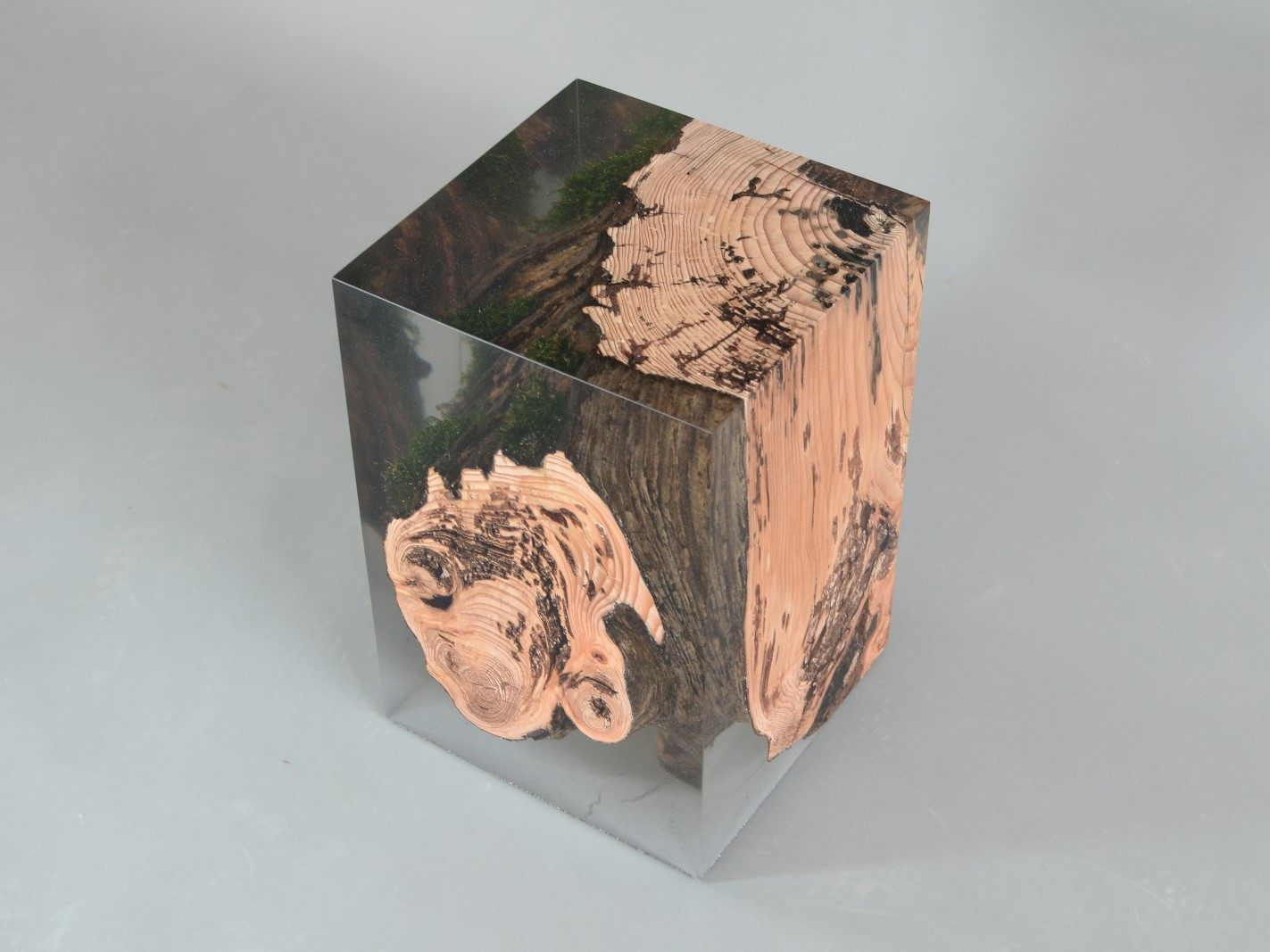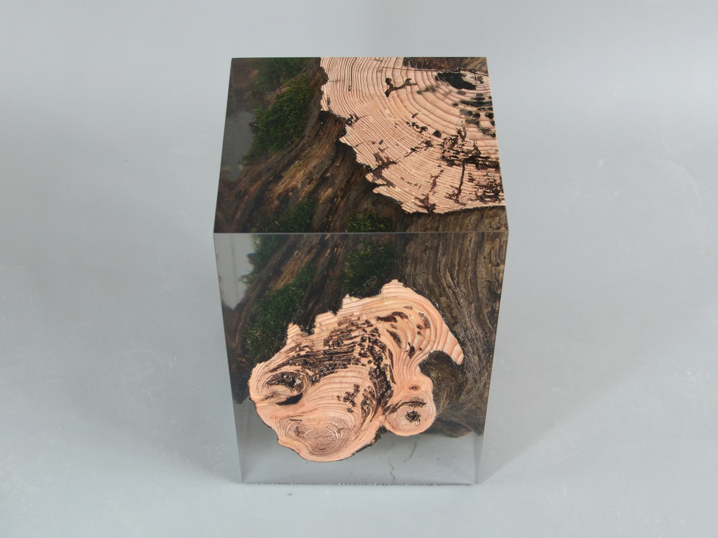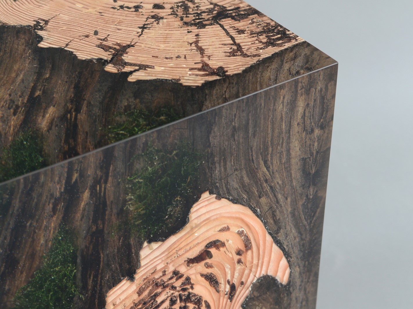 alcarol recover discarded pieces of logs from the undergrowth of the Italian Dolomite mountains and preserve the natural bark surface with their native populations of plants, which are embedded in a resin resembling the water that generated their life.