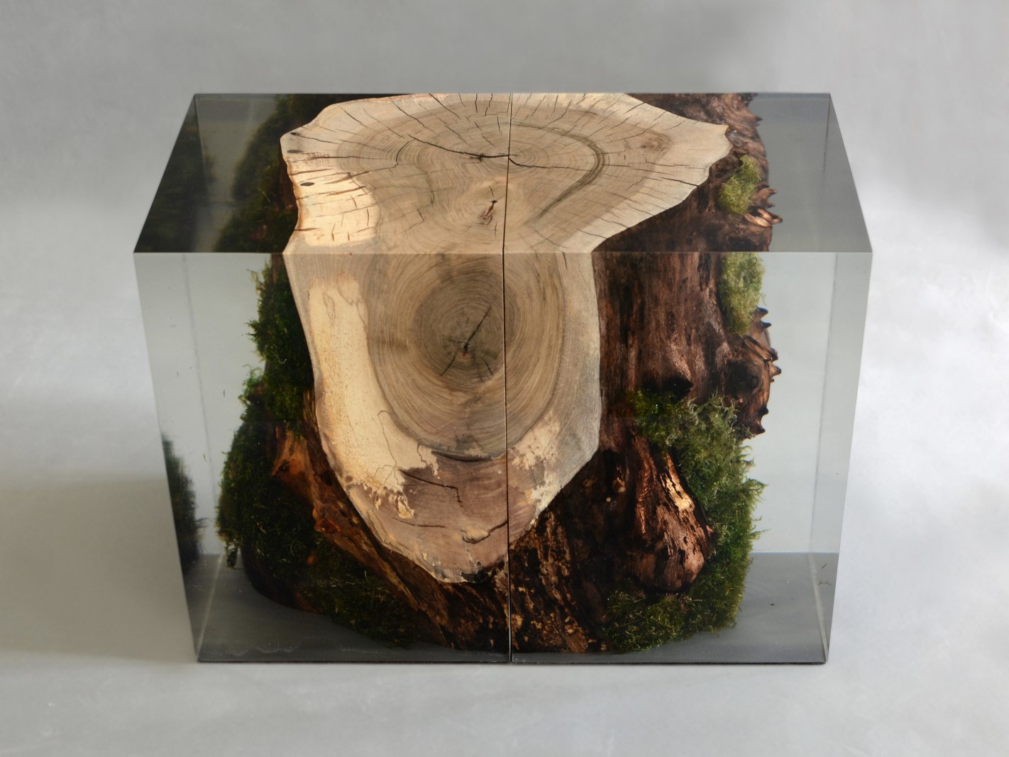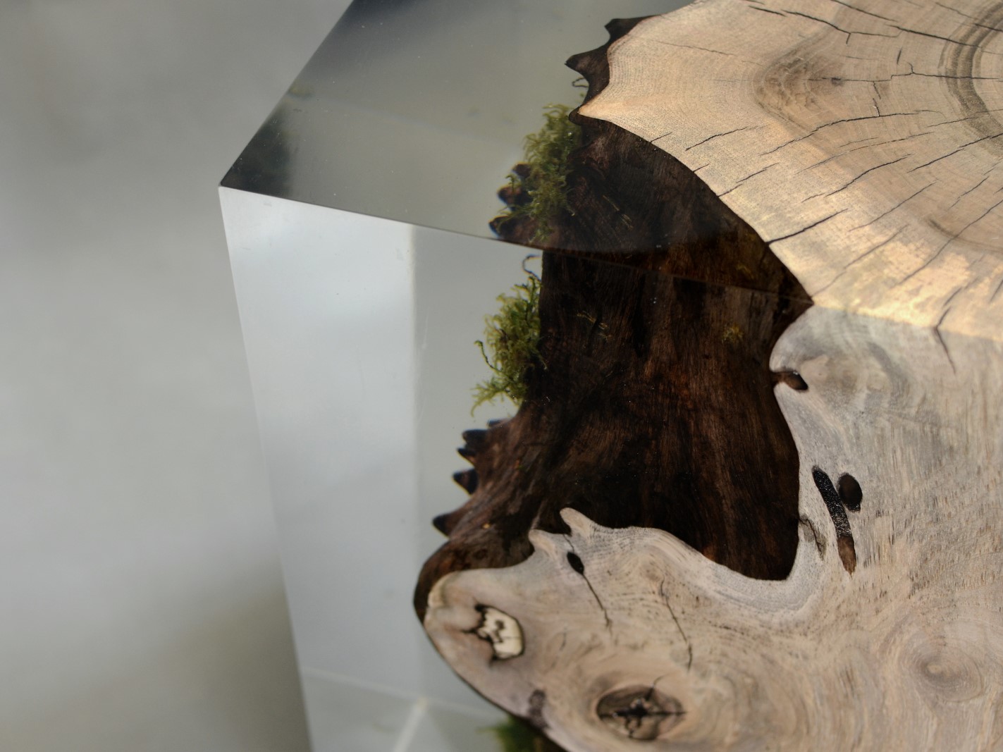 alcarol recover discarded pieces of logs from the undergrowth of the Italian Dolomite mountains and preserve the natural bark surface with their native populations of plants, which are embedded in a resin resembling the water that generated their life.