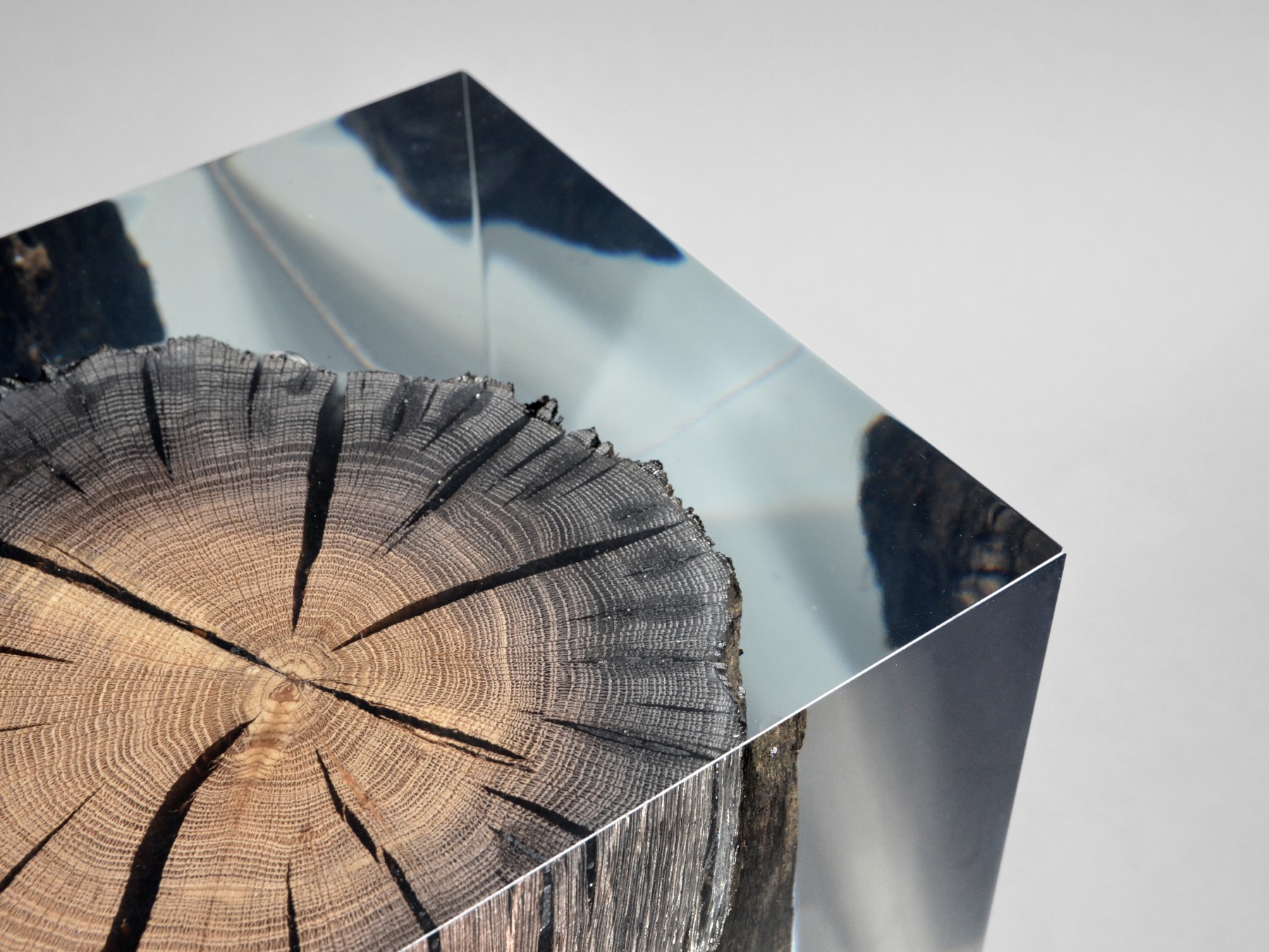 Like the water over millennia, the alcarol’s transparent resin surrounds the organic shapes of this unique wood, preserving and enhancing all its preciousness and charm.