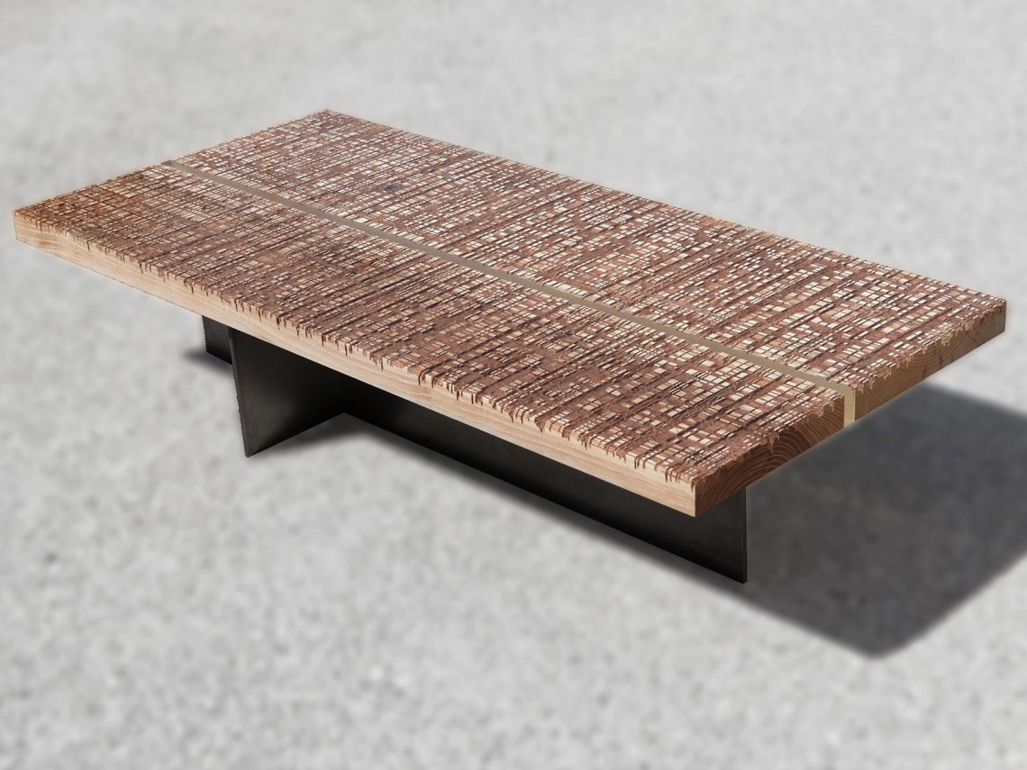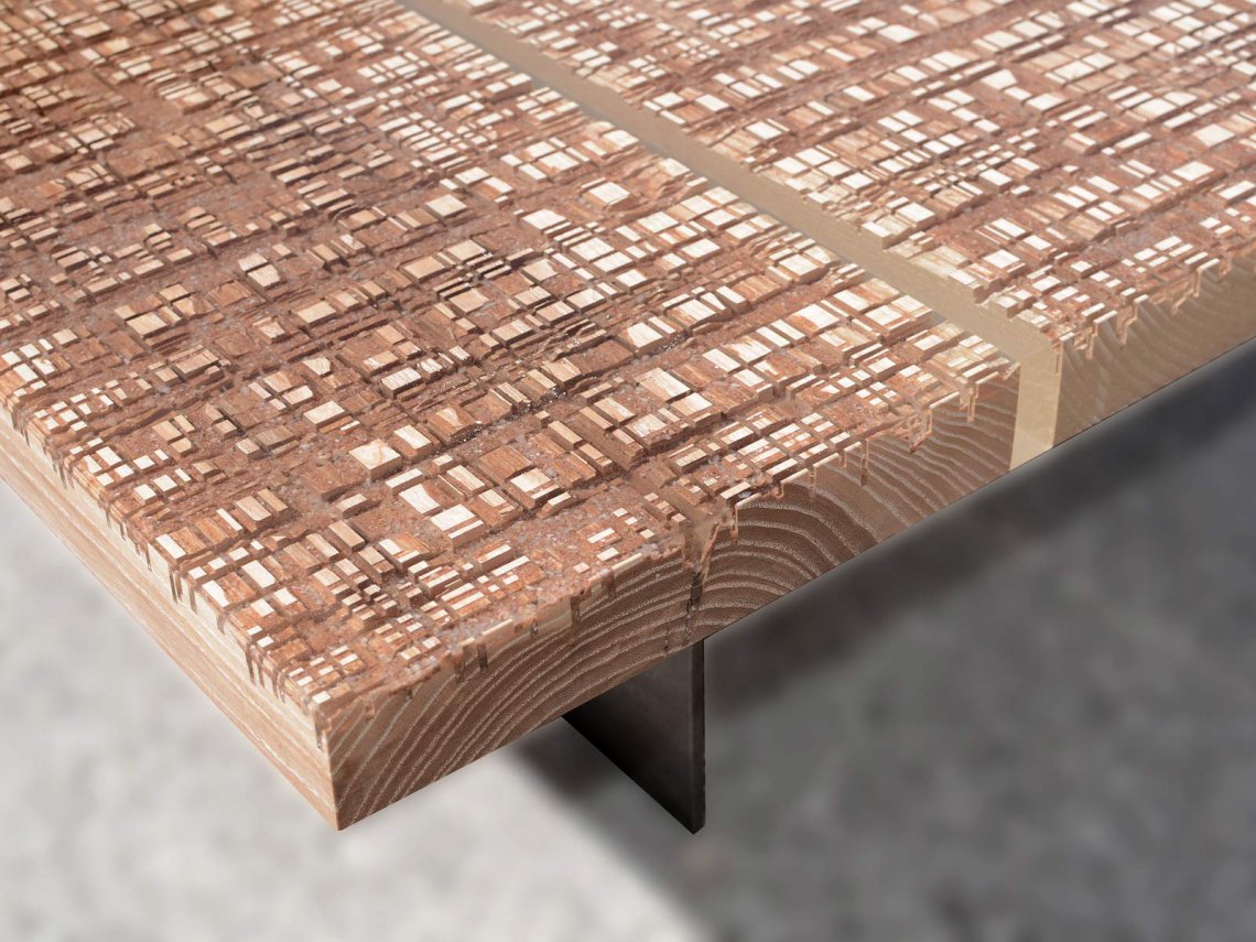 In line with the story of the material used, the metal base of this piece is inspired by the blades used for cutting stones, made of laser cut sheet steel and assembled by simple joints.