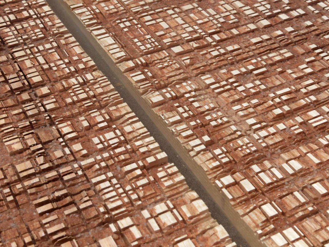 Like the water flow of the cutting operations, a transparent resin is poured on the uneven wood surface to encapsulate marble residues and level all the roughness.