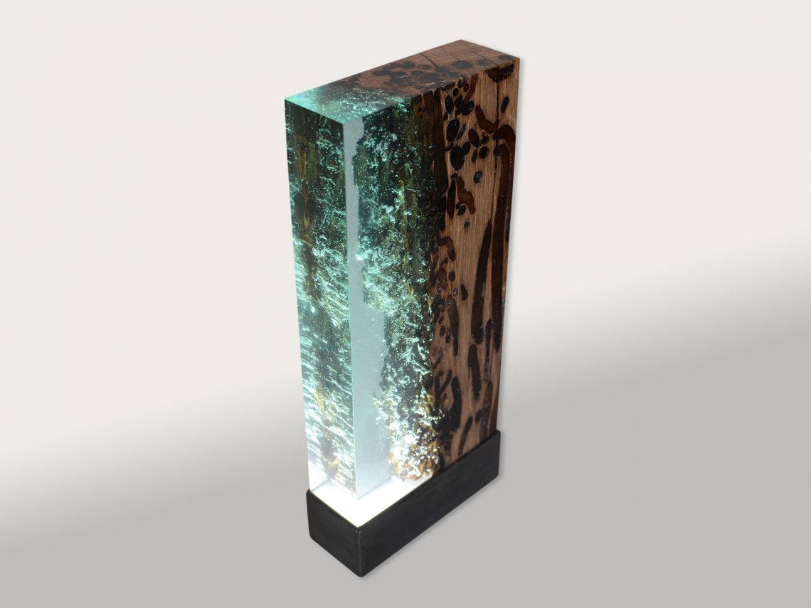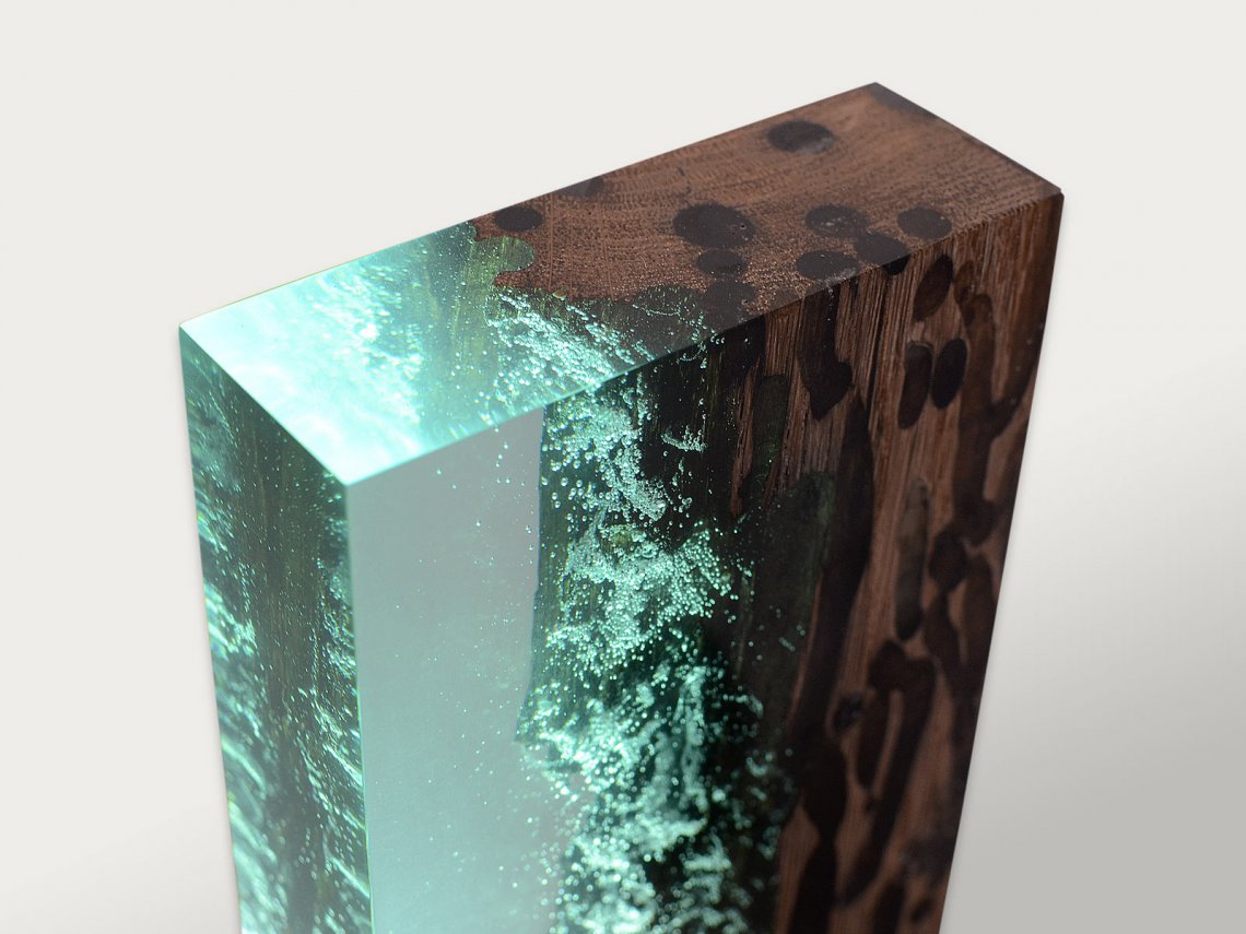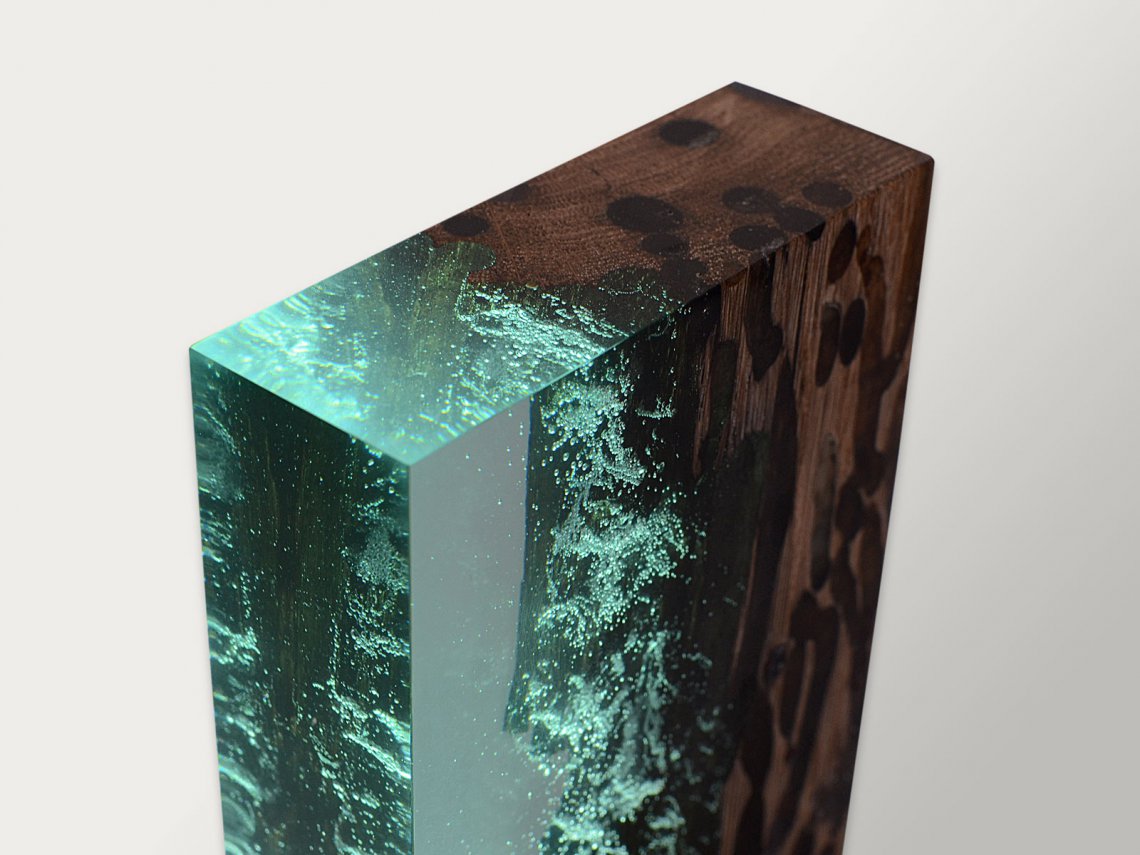 Water Bright is a fragment, a synthesis of the millennial relationship between wood and water. It ‘s the story of the profound and romantic rapport that develops between these two elements in Venice. The light of variable intensity reveals the poetry of this union and referts to the Lagoon atmosphere. alcarol has patented an elaborate craftsmanship capable of filling only the empty spaces of the wood with a transparent resin capturing the underwater air bubbles that bring the wood back to the original look and conditions in the depths of the Venetian canals.