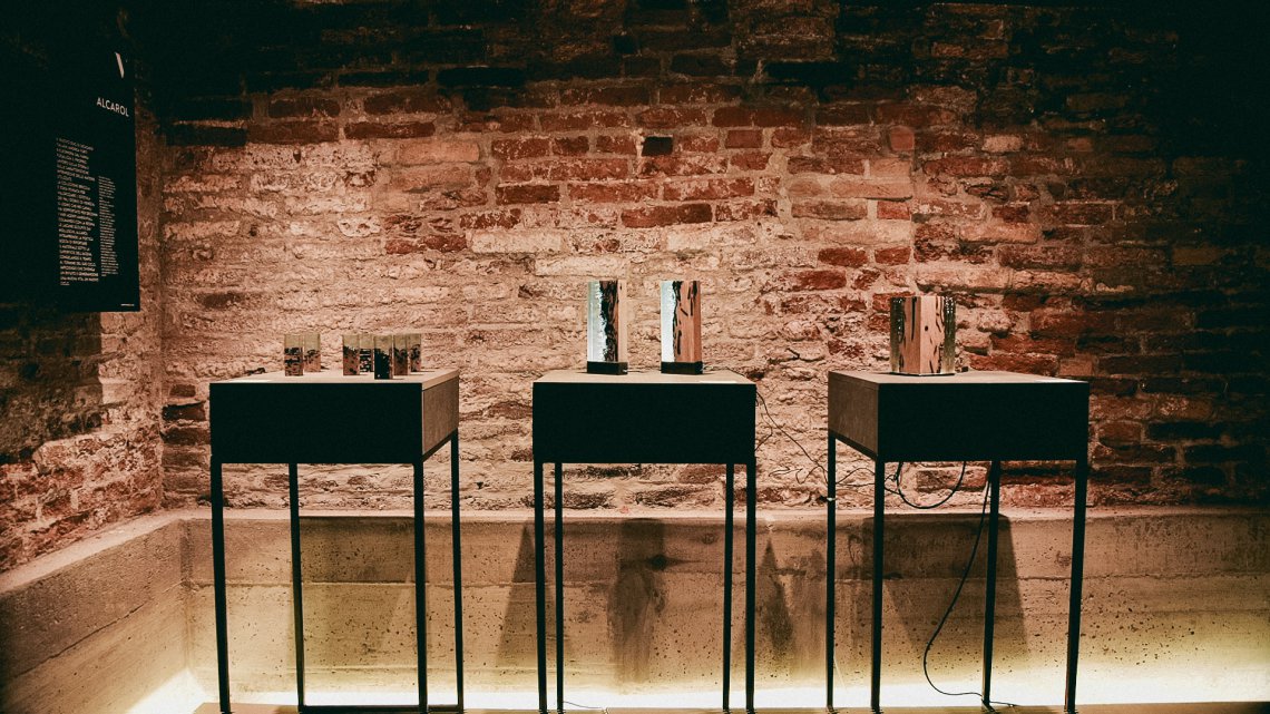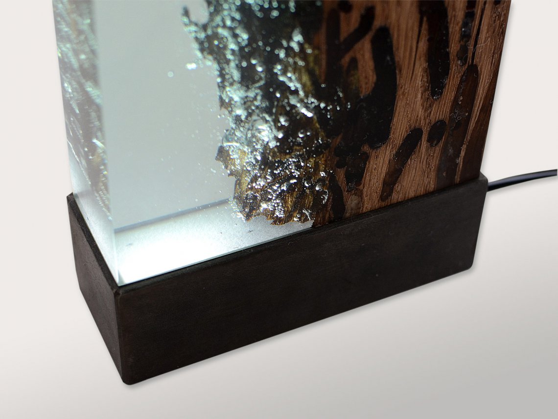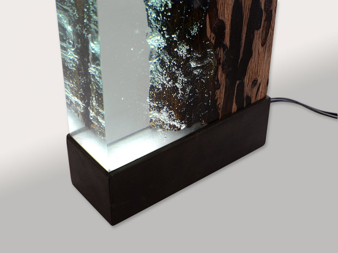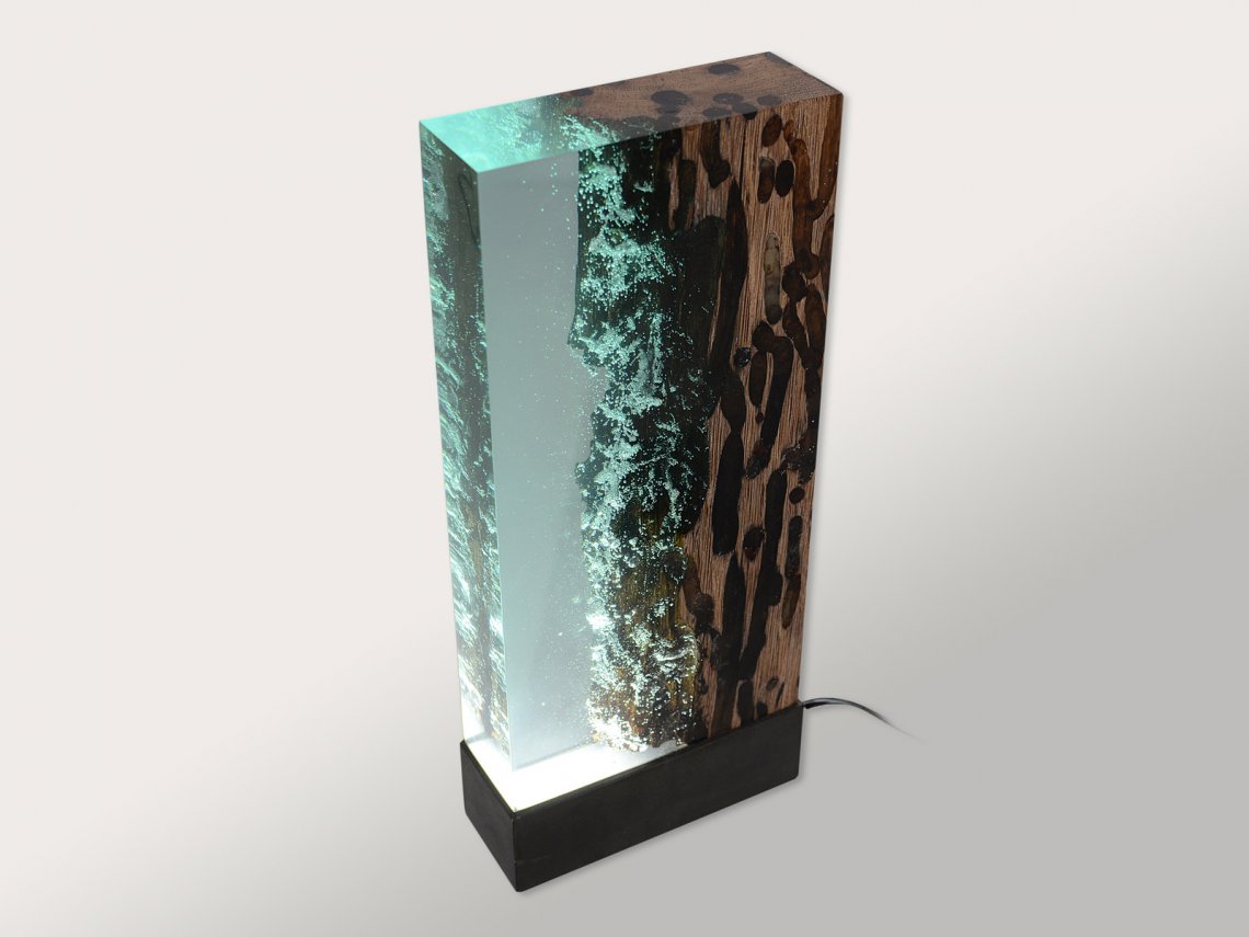 Water Bright is a fragment, a synthesis of the millennial relationship between wood and water. It ‘s the story of the profound and romantic rapport that develops between these two elements in Venice. The light of variable intensity reveals the poetry of this union and referts to the Lagoon atmosphere. alcarol has patented an elaborate craftsmanship capable of filling only the empty spaces of the wood with a transparent resin capturing the underwater air bubbles that bring the wood back to the original look and conditions in the depths of the Venetian canals.