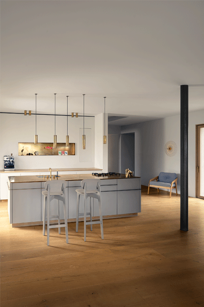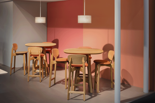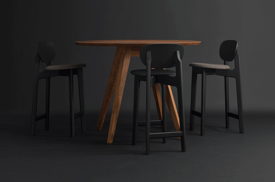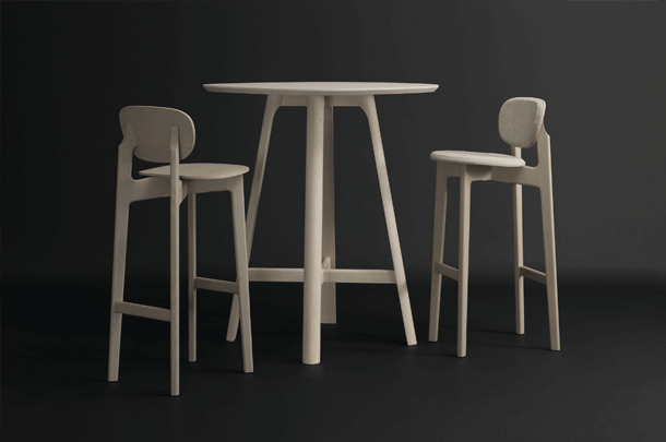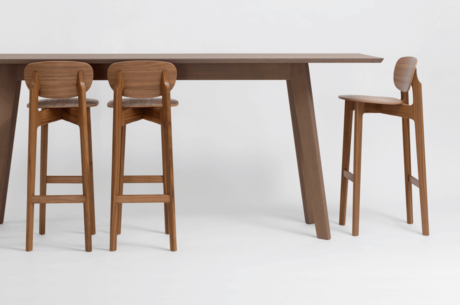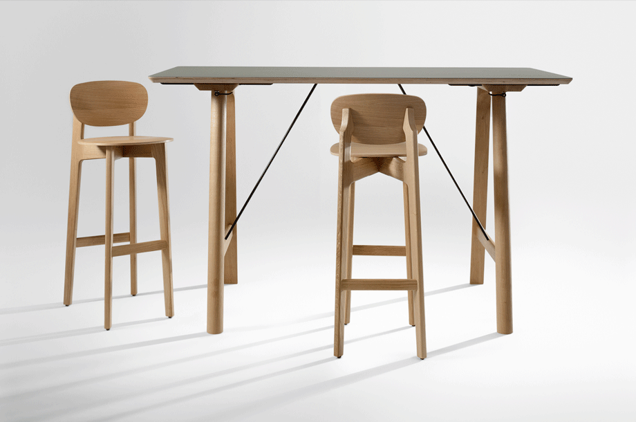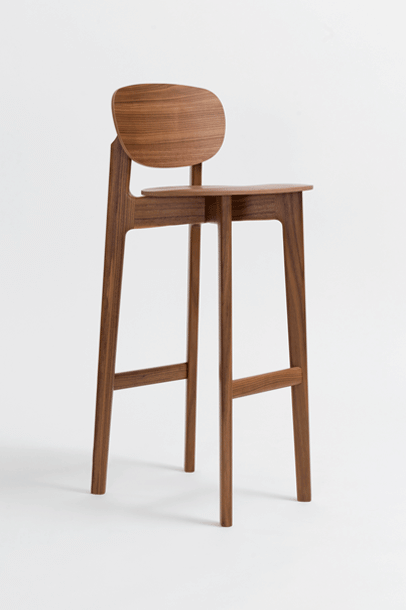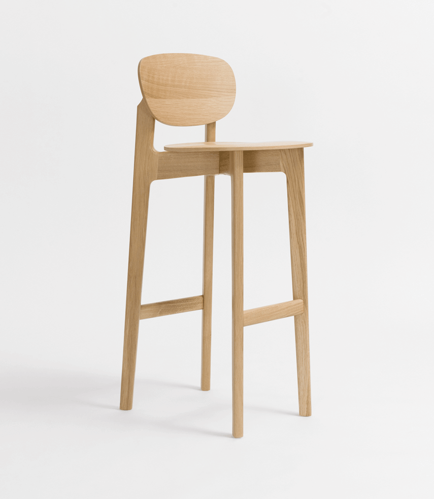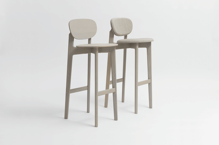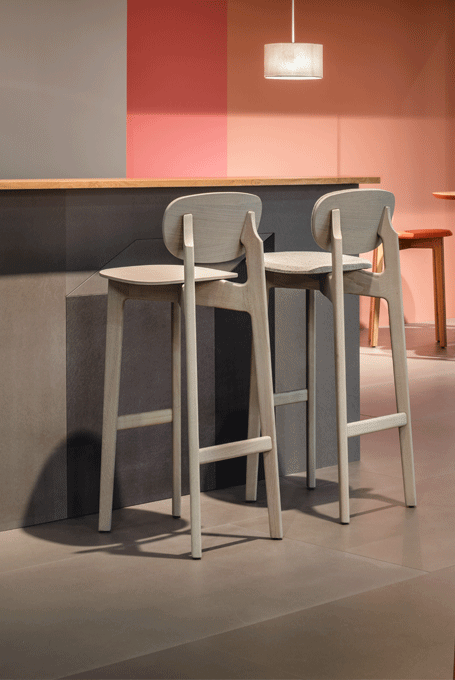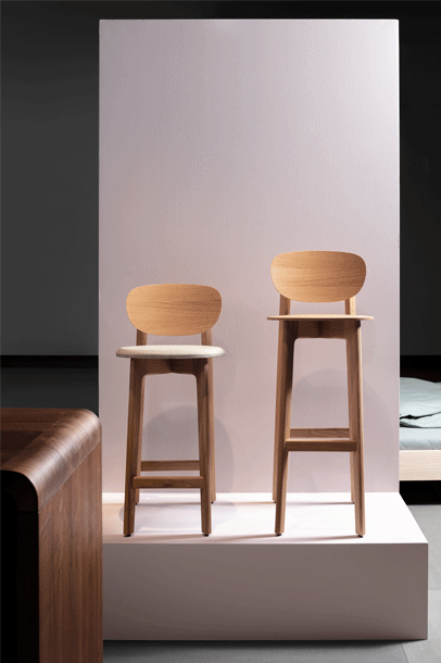 The character of the bar stool ZENSO BAR is reflected in its sculpturally expressive wooden frame, in combination with a light shell that rests upon it, floating and aesthetically pure. The high level of stability of the bar stool requires a cross construction of solid wood. The shells consisting of moulded wood appear light and inviting. ZENSO BAR is available either with a wooden seat and back shell, with an upholstered seat and back shell or with an upholstered seat and wooden back shell. ZENSO BAR is available in seat heights of either 65 or 80 cms, each with a footrest.