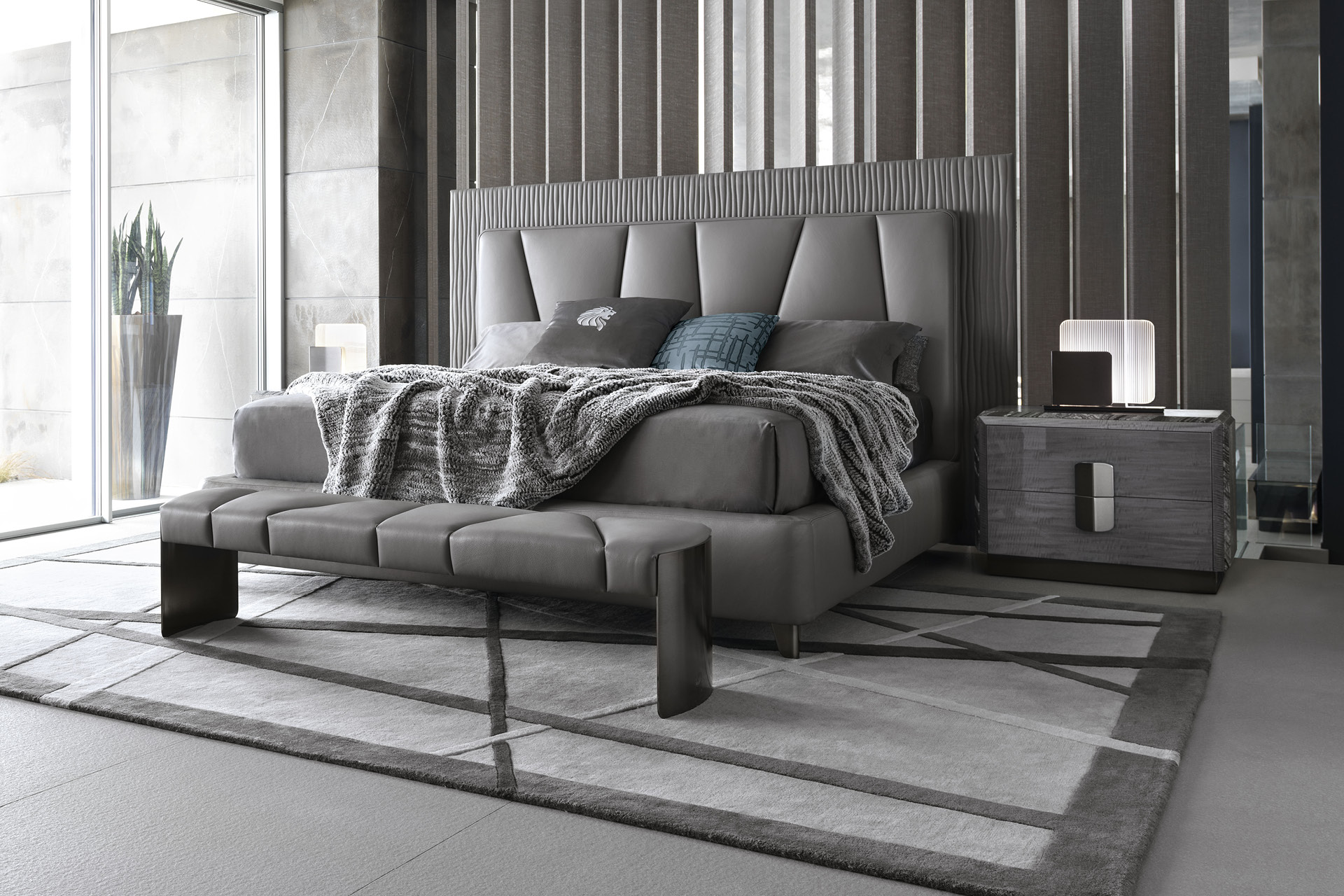 Bench available in first grade leather, nubuk leather, lizard printed leather, velvet or suede fabric. Curved legs in satin black nickel stainless steel with lasered Giorgio Collection logo.