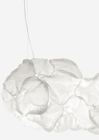 Co-operating closely with the belux company, Frank O. Gehry has, for the first time, designed a collection of lamps for serial production. The name alone –cloud– evokes the poetic nature of these creations, which, according to their maker, should convey ‘the feeling of freedom and eccentricity’. The lamps are available in various sizes and models, such as suspension, standing, floor and table lamps. Each lamp has a voluminous yet delicate paper-like shade, in the centre of which is the invisible light source. With its irregular sculptural shape, marked by countless folds, crimps, bulges and dents, it suggests a fleecy cloud and then again a large, soft snowball. Looked at more closely, the lampshade consists of several interlinked cup-like elements. Each lamp has an individual note in spite of all lamps having the same structure and the same predetermined shape. The idea is that the fold structure of the shade, which is shaped more or less by accident during production, can be changed by bulging it out or pressing it in. In doing so, Gehry makes users into co-designers who can repeatedly change the shape of the lamp if they so wish.
