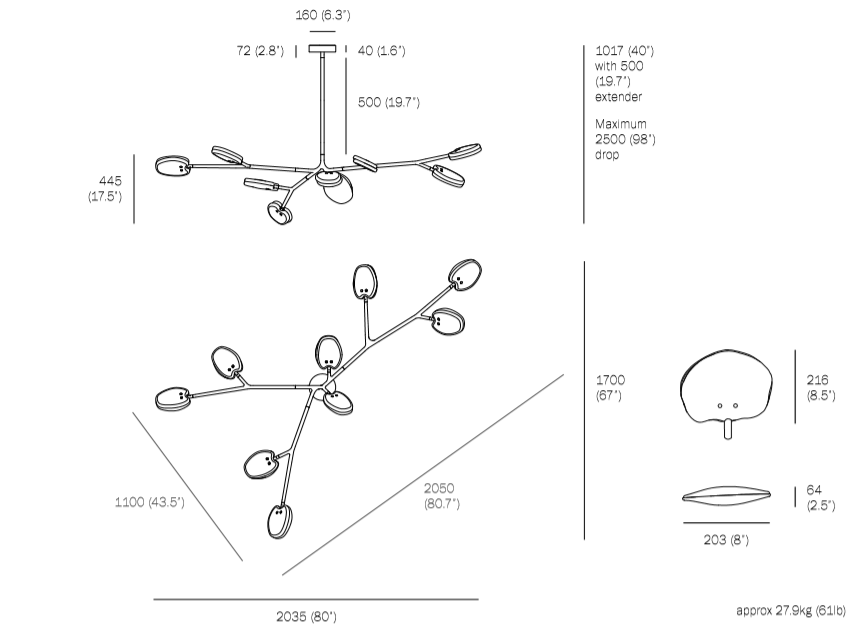 A stainless steel armature system in a soft-touch matte black finish allows pre-composed branches to be easily connected to a series of hubs during installation.
