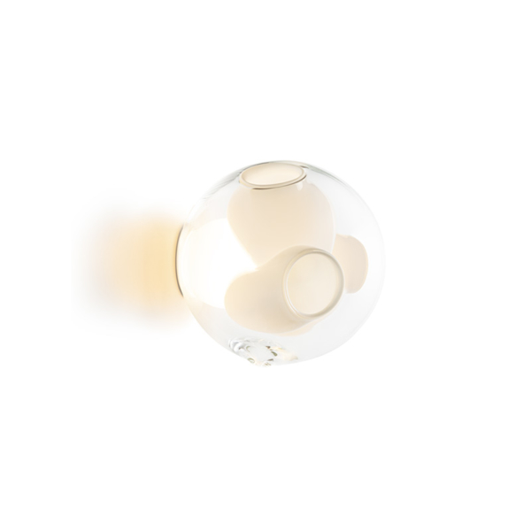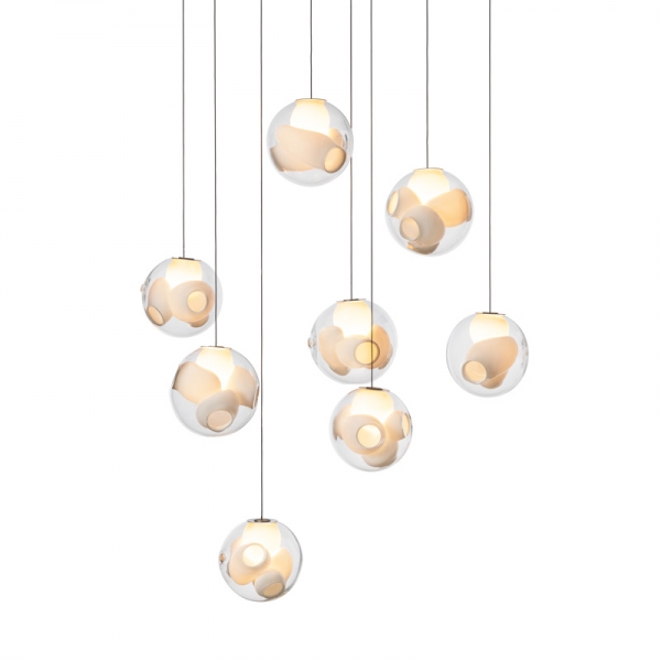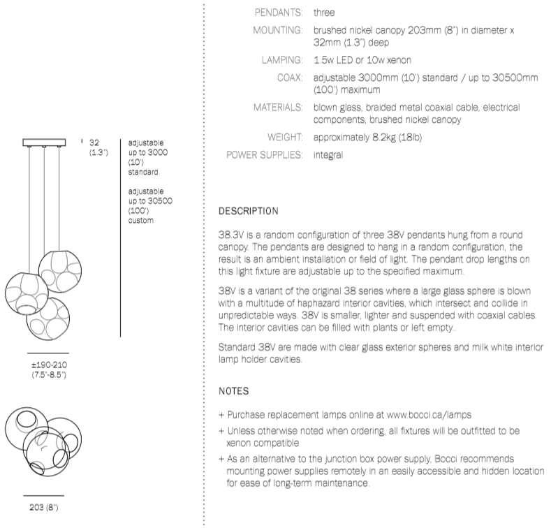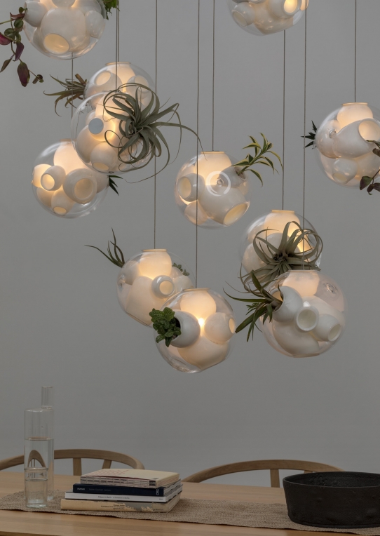 38V is a variant of the original 38 series where a large glass sphere is blown with a multitude of haphazard interior cavities, which intersect and collide in unpredictable ways. 38V is smaller, lighter and suspended with coaxial cables. The interior cavities can be filled with plants or left empty.