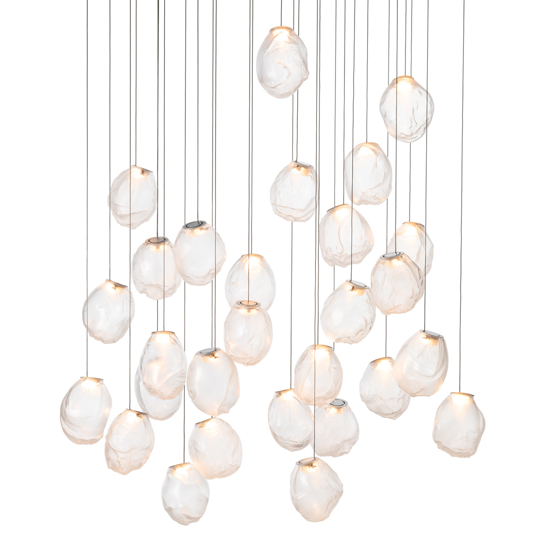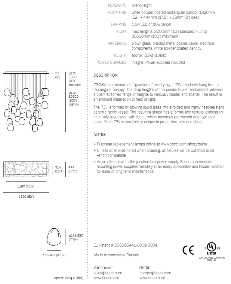 73.28V is a low voltage arrangement of 28 blown-glass pendants. Each pendant is hand blown into a folded and highly heat-resistant ceramic fabric vessel. Each pendant is housed with a 10 watt xenon or 1.5 watt LED lamp.