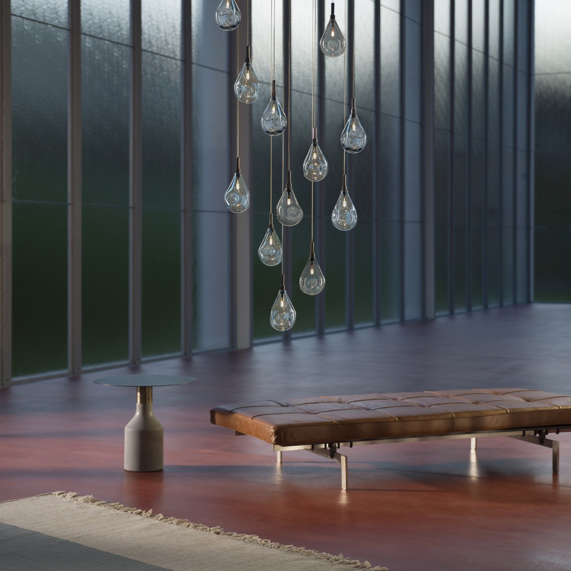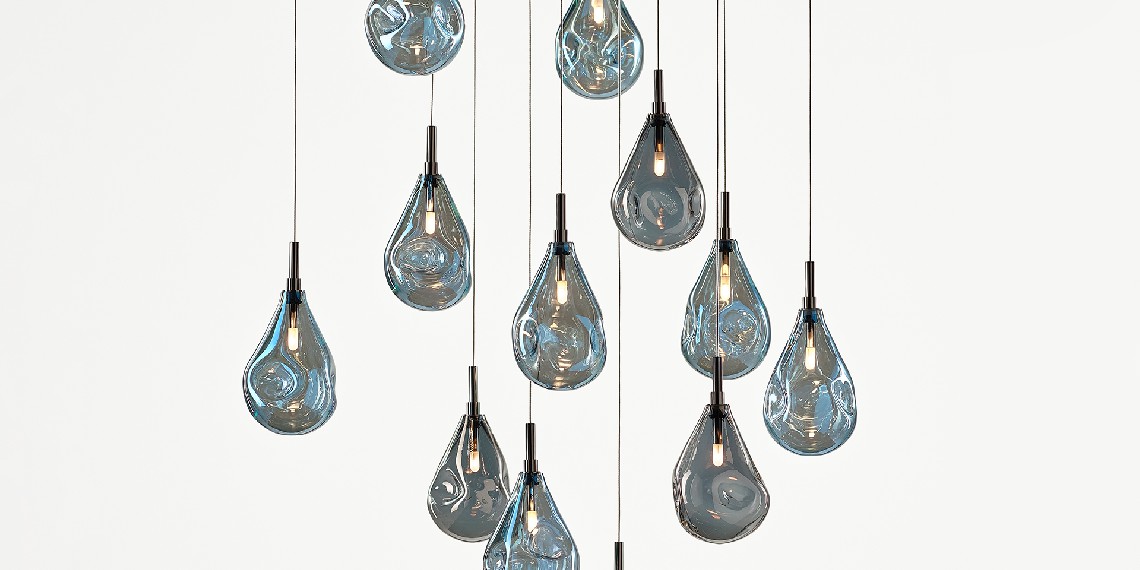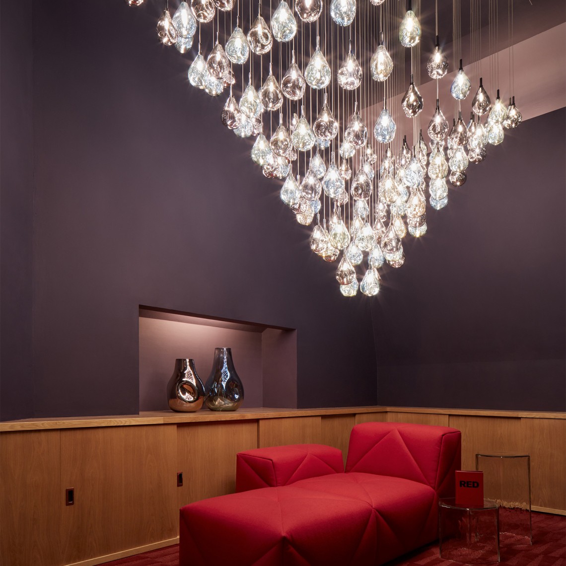 Varied colors, transparency and continuously changing shapes – the characteristic features of soap bubbles-- inspired this BOMMA collection. When lighted, the metallic sheen of its surface transforms to iridescent and translucent, exposing its crystal character. The entire collection is produced using the technique of hand-blowing without a form. The seemingly perfect droplet of molten glass is given a unique shape as well as a unique color spectrum.  The Soap Mini collection allows unlimited space for your creativity, with the option to create as large groups of crystal drops as you fancy – from smaller compositions to expansive light constellations.