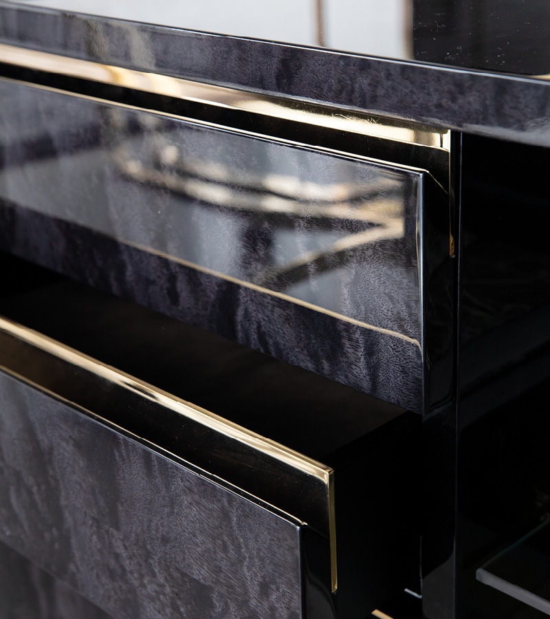 Return for desk on wheels in Black Bubinga burl veneer with high gloss polyester finish.Top in tempered black glass.3 full extension drawers with bottom part in velvet fabric.2 open sides with 1 glass shelf. Base and handles in light gold chrome stainless steel.