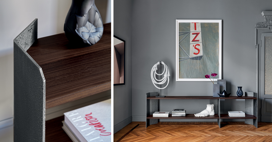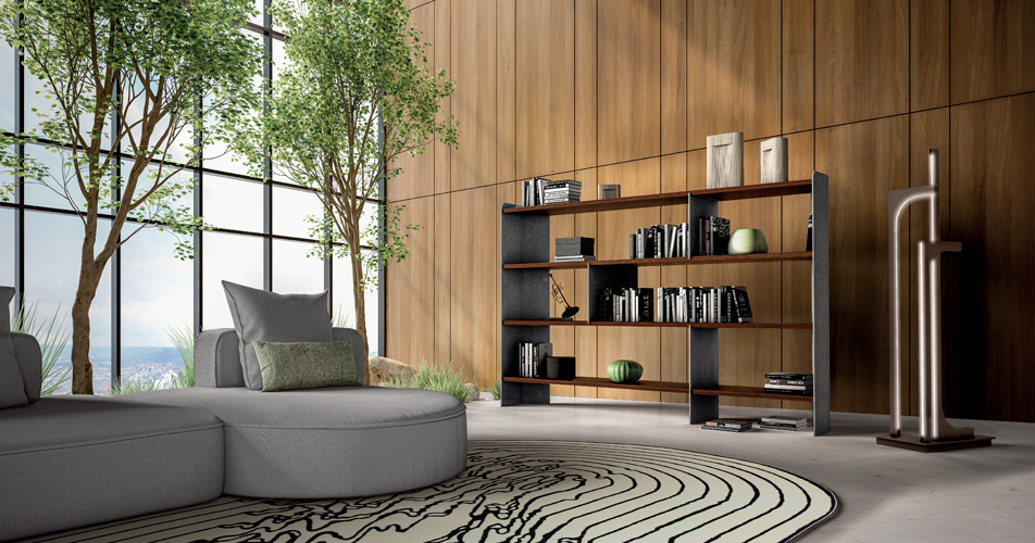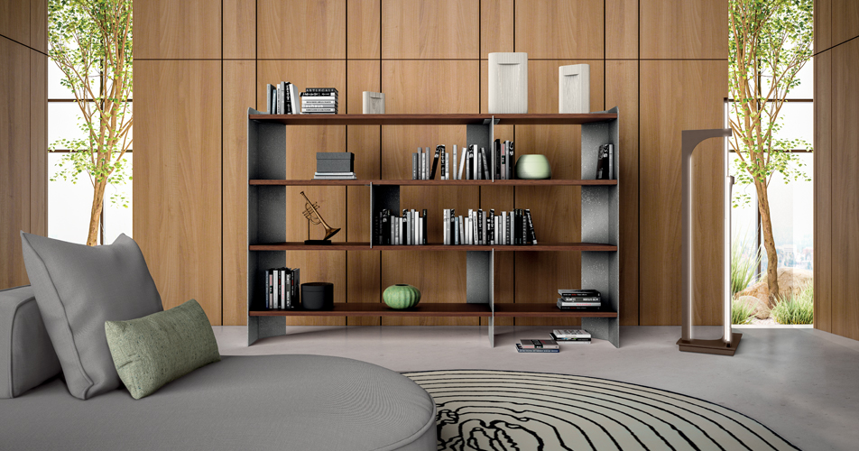 “La libreria di un uomo ti dirà tutto quello che dovrai sapere su di lui”. Così scrisse il romanziere Walter Mosley, riportando una citazione di suo padre. Certamente, la libreria è il pezzo di arredamento di una casa o di un ufficio che, tra tutti, è in grado di rivelare la natura di un’anima, una finestra sugli interessi, le esperienze e l’eredità delle persone. Nella famiglia di mobili Executive Office la libreria Carter risponde con geometrie più regolari a quelle più articolate della scrivania. Qui, Lipparini ottiene un senso vitale di rigore e versatilità per le funzioni del contenere e dell’esporre. Ai piani orizzontali, realizzati in un legno esotico come l’eucalipto, si alternano i pannelli verticali in metallo lavorato e texturizzato in un ritmato ordine sparso, scandendone il fraseggio irregolare, come in un pentagramma musicale. La combinazione di materiale e forma cinetica rende Carter qualcosa più di un utile prodotto per l’oggi.