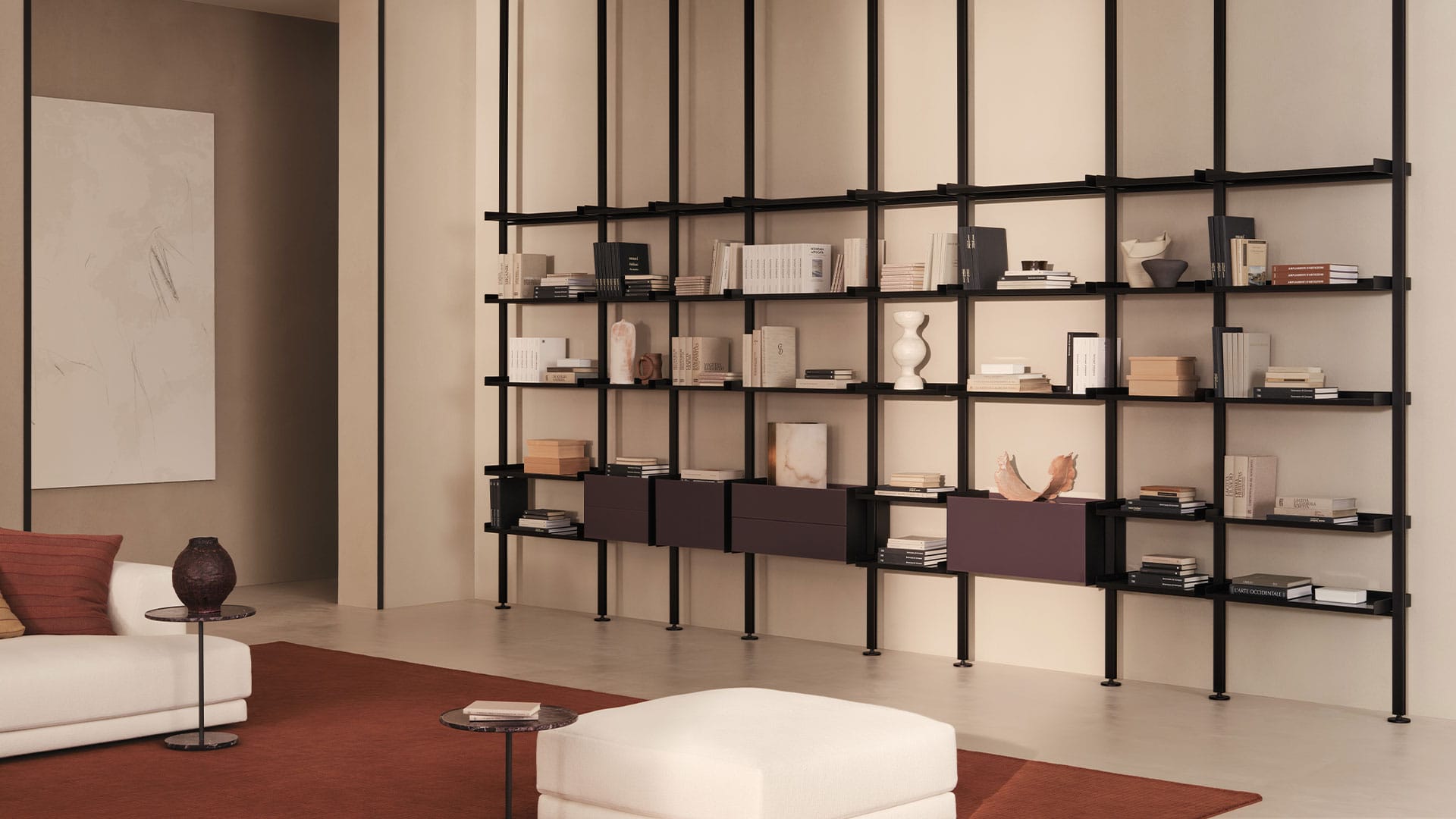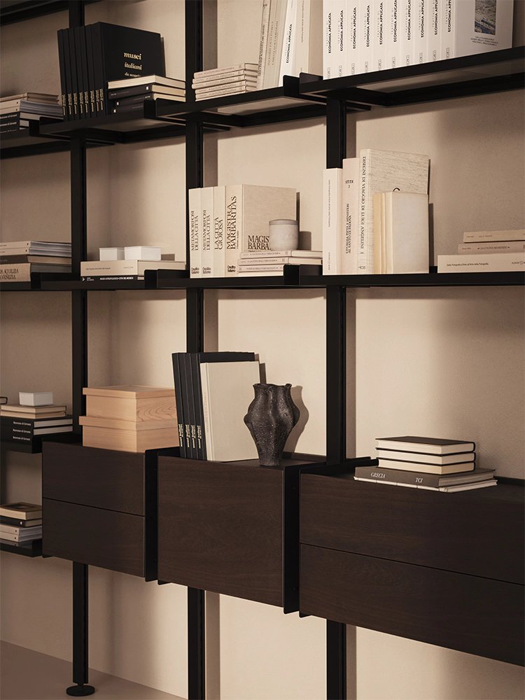 The evolution of functionality. SaintPaul traces out the contours of the Wigmore Shelving System, enriching it with new features and finishes. Three different sizes for the tops made of anodised extruded aluminium and the possibility for pairing with clear glass, Dark Grey, Metropolitan, Garage, Rovere Affumicato. The cabinet modules are available in the two-drawer pull-out version or with flap door in the finishes Laccato Lucido, Rovere Affumicato, Vetro Nero, Rosso Petra.