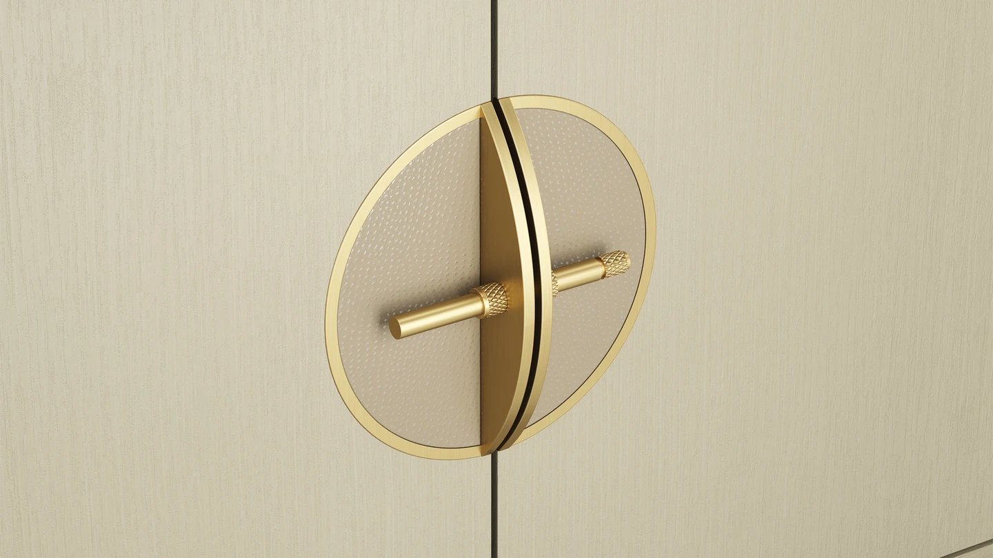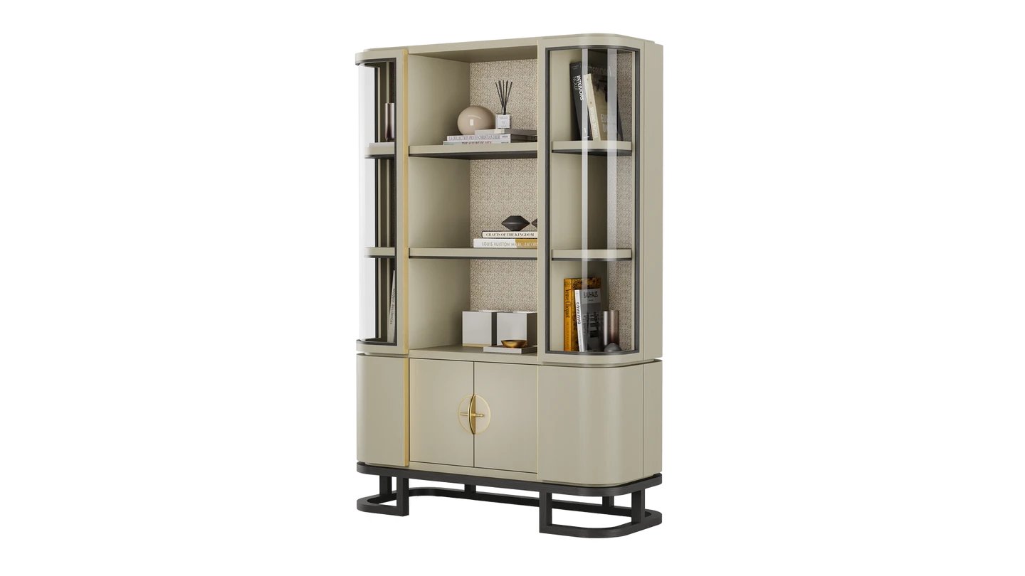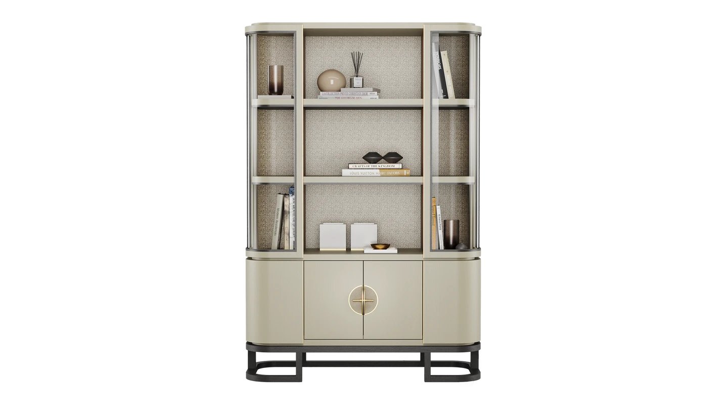 The WYOMING Bookcase perfects the balance between statement and subtle with its sleek curves. It offers plenty of storage space with shelves and cupboards. Intricated details such as inlayed leather and wallpaper and brushed brass highlights give it a luxe appeal.