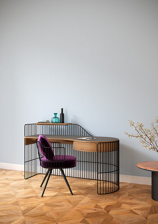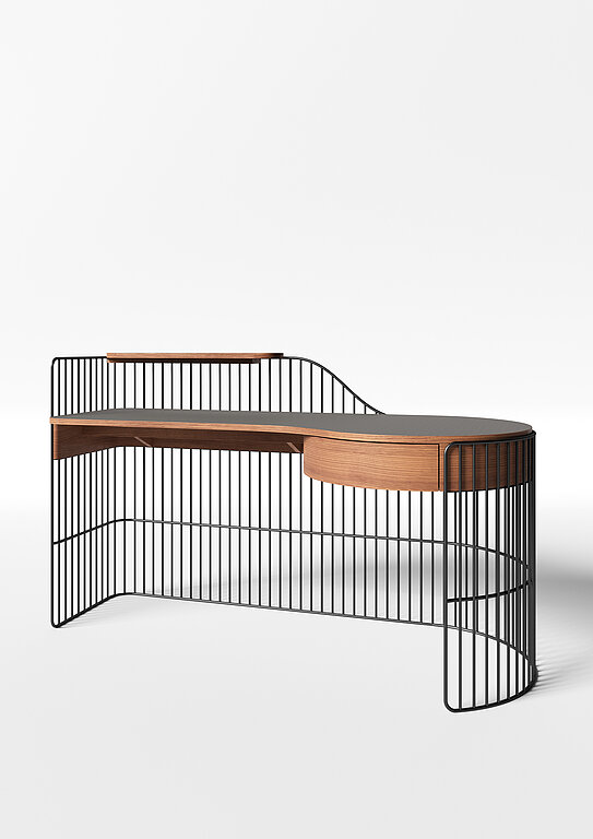 Der asymmetrische Schreibtisch der PARADISE BIRD Kollektion von Luca Nichetto l?dt mit seinen gewundenen Kurven und eleganten Linien zur Interaktion ein. Der ikonische Arbeitsplatz mit Fronten aus schwarz gebeizter Esche oder Nuss natur, einer edlen matt beschichteten schwarzen Oberfl?che, zweistufig mit einem Regal zur Organisation und Aufbewahrung, wird von der für die Kollektion typischen und an eine Voliére erinnernden, feinen Metallstruktur getragen. Nahtlos in die Seitenwangen integriert sich eine leichtg?ngige Schublade, welche die meisterhafte Handwerkskunst im wahrsten Sinne und perfekter Form abrundet.