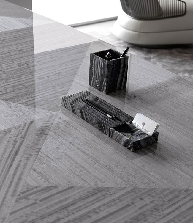 Presidential desk in inlaid Tasmanian curly Eucaliptus veneer with high gloss polyester finish. 2 full extension drawers with bottom part in velvet fabric and 1 file drawer on each side. Base and handles in satin grey nickel stainless steel.