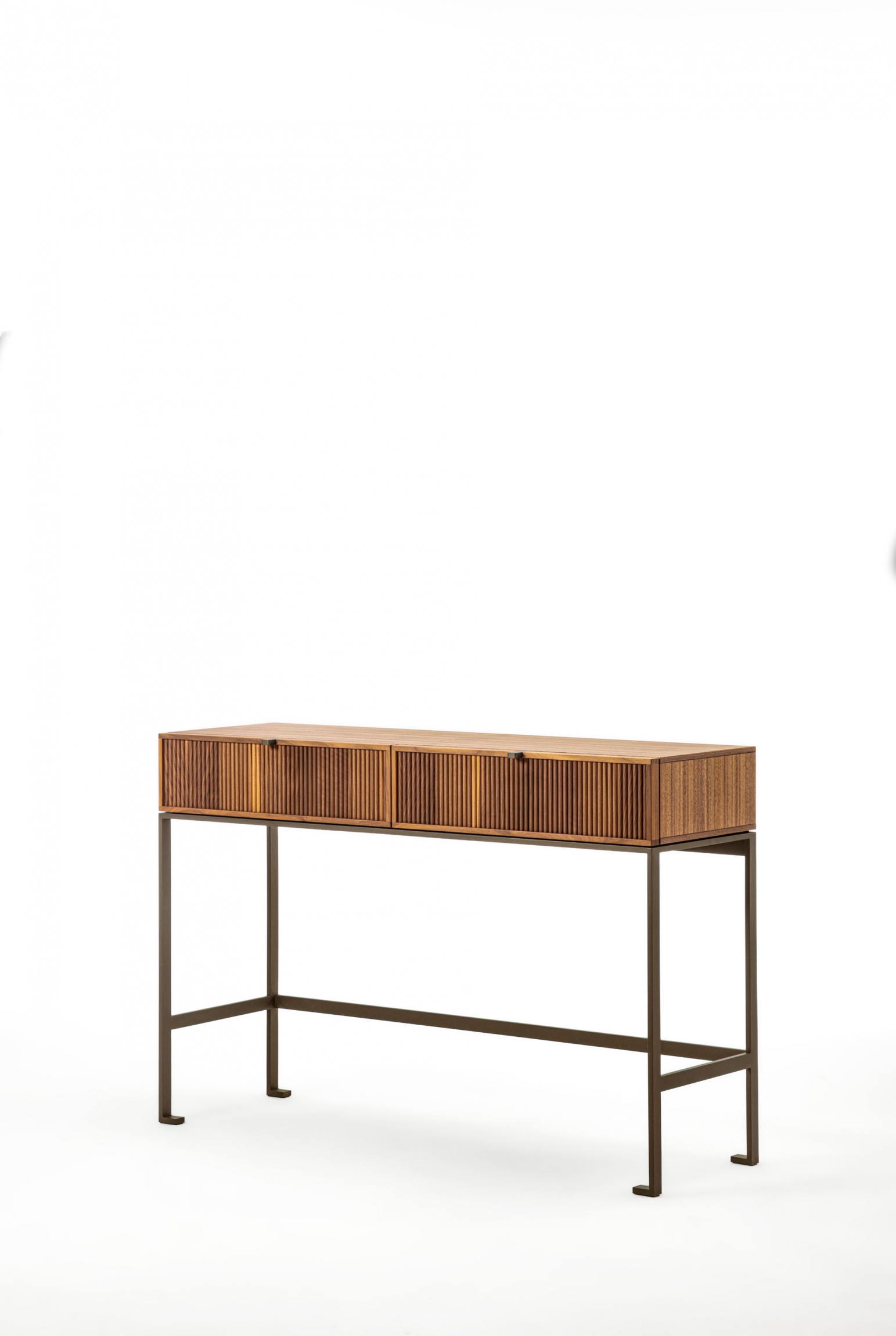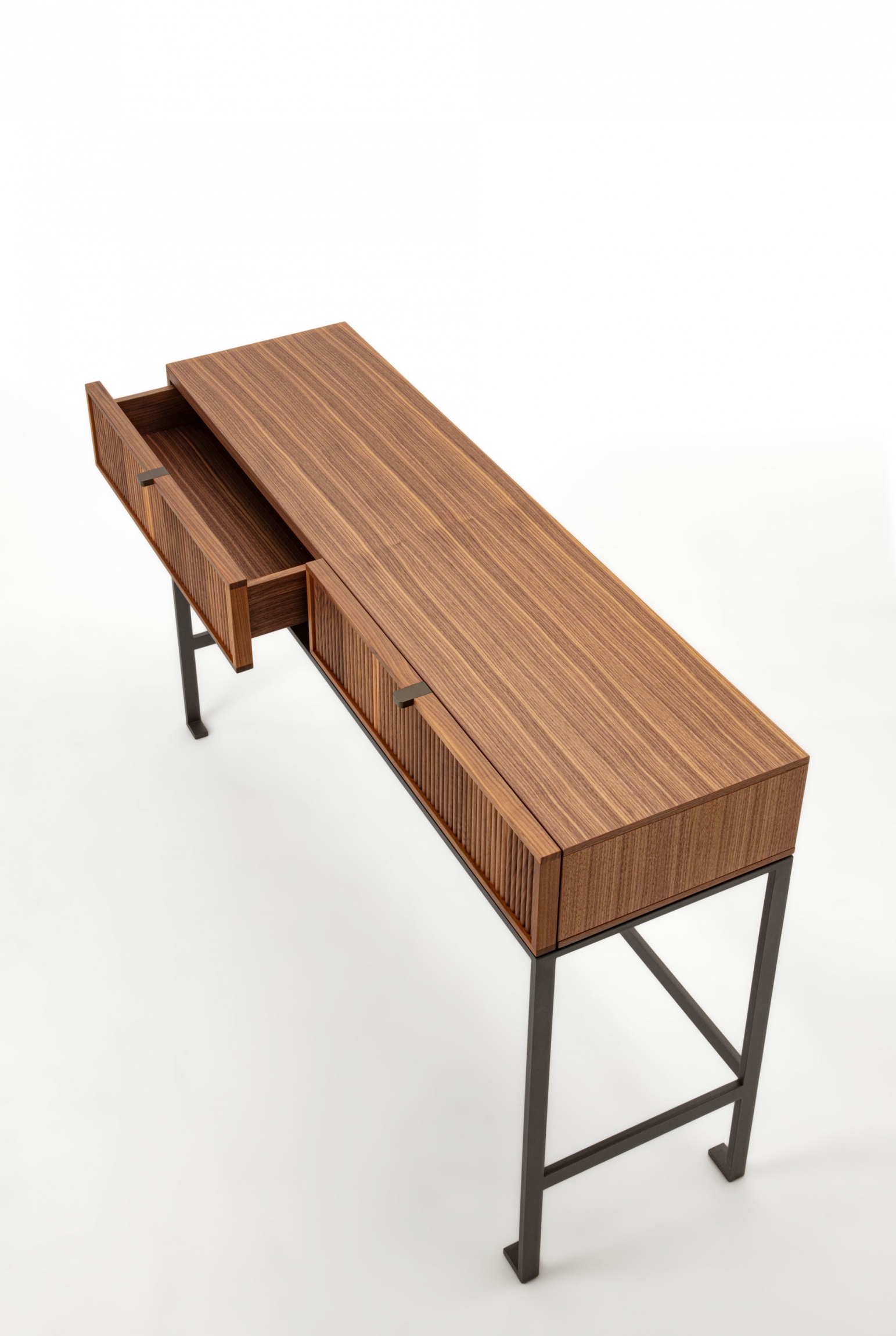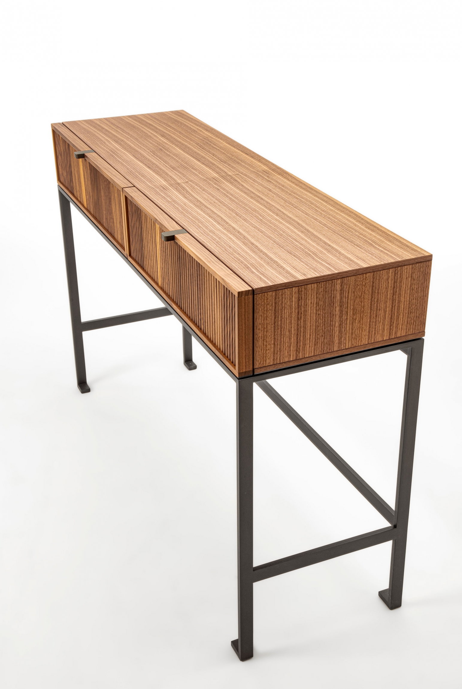 Wood console table with metal base. The top is made of wood, and on the front, it is possible to have two drawers with a canned finish or alternatively two drawers with leather-covered front.
