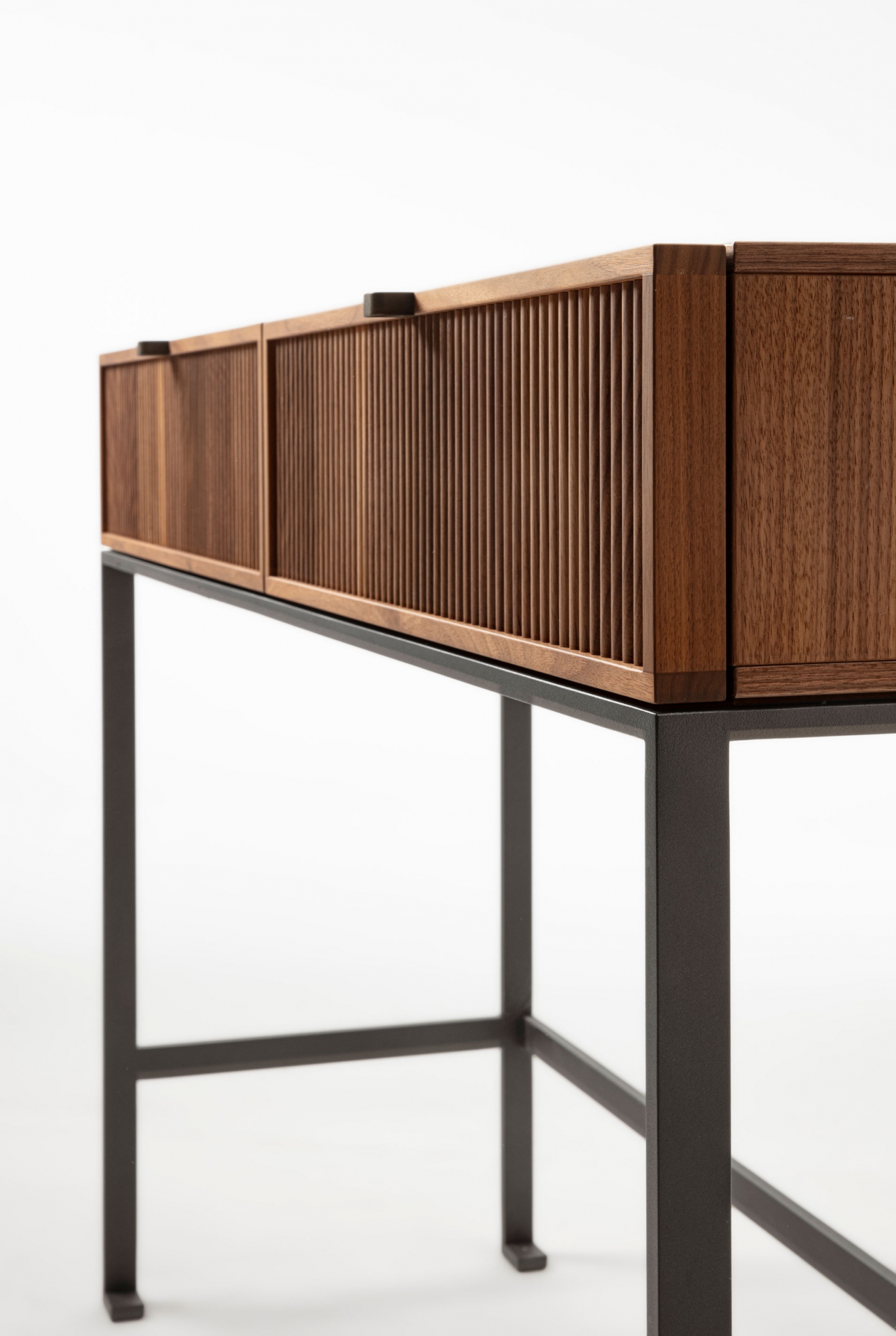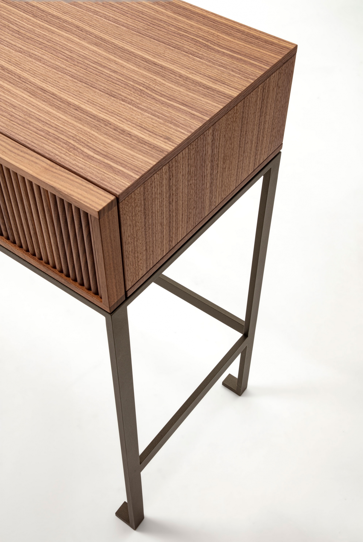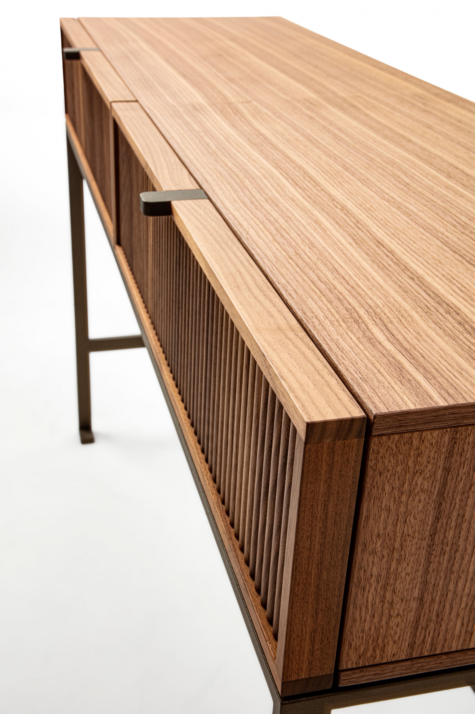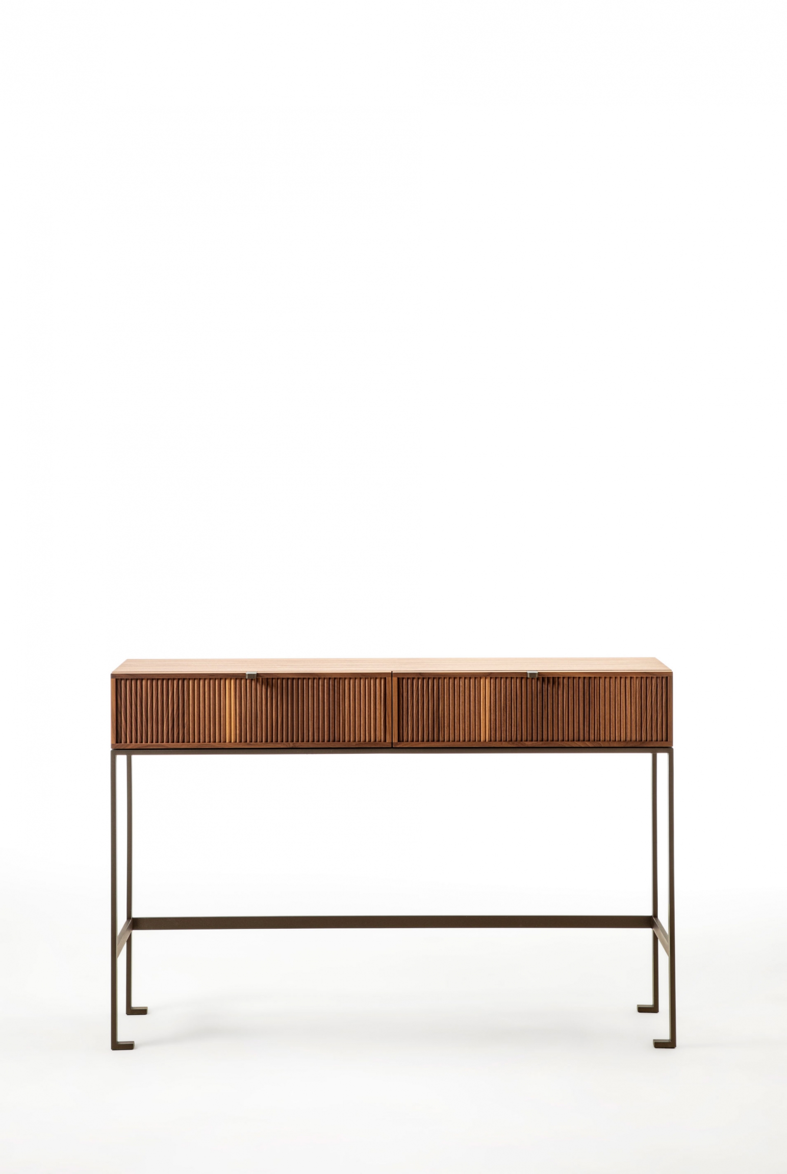 Wood console table with metal base. The top is made of wood, and on the front, it is possible to have two drawers with a canned finish or alternatively two drawers with leather-covered front.