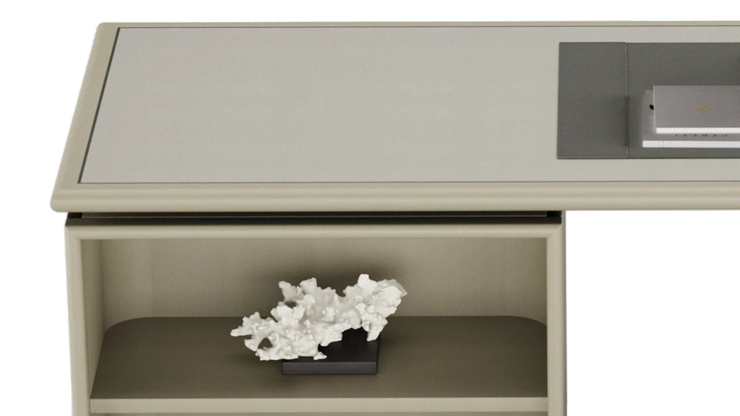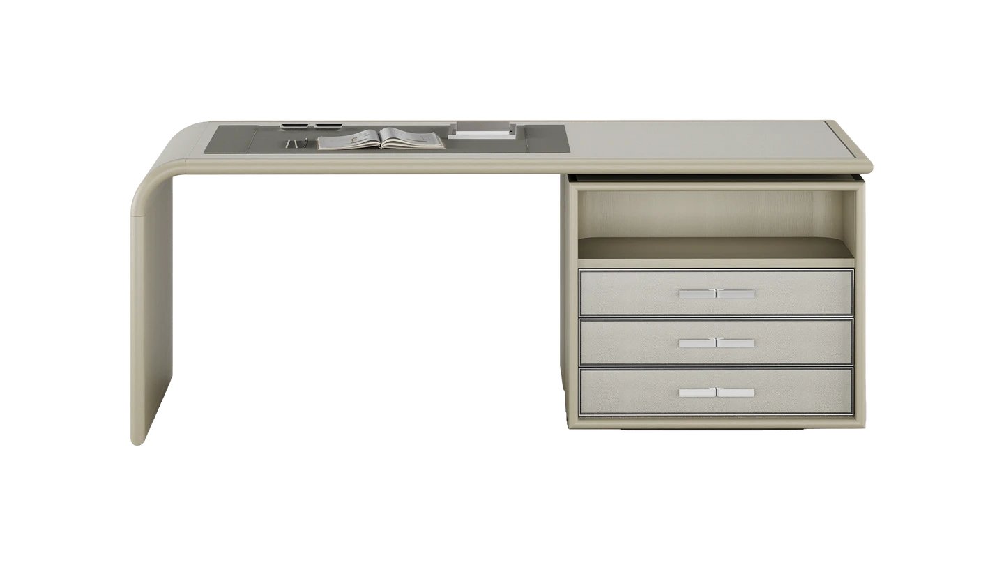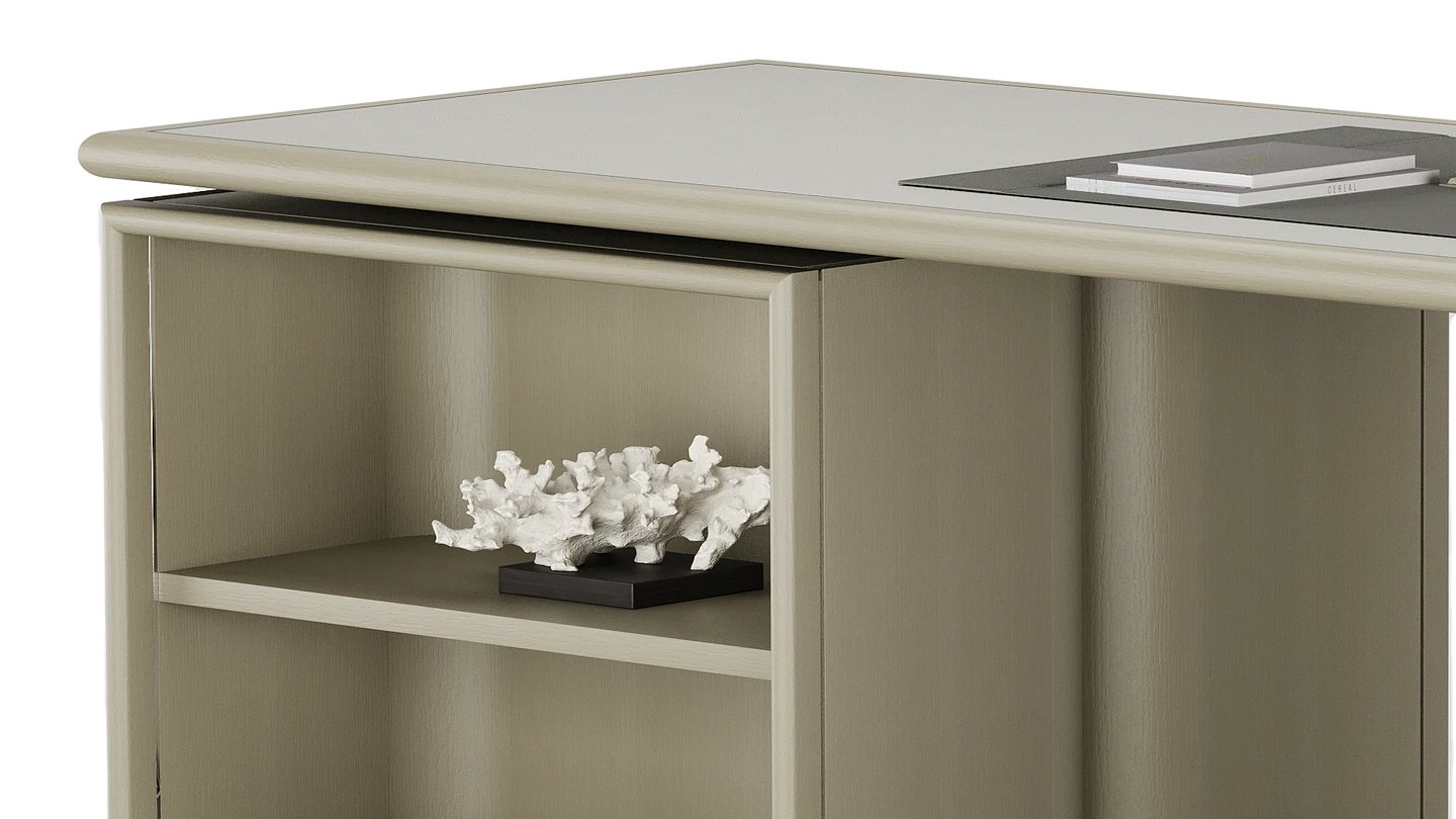 Vintage meets modern in our HATTA Desk, which combines a smooth curved shape with practical shelving. It’s crafted from satin open-pore wood and features leather, suede and stainless steel details.