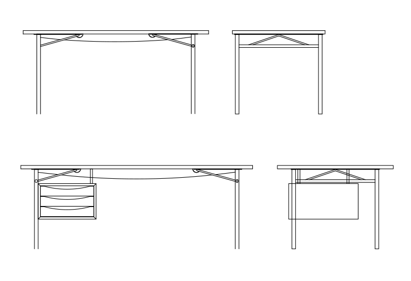 Materials: Teak, oak, walnut, Oregon pine veneer or linoleum in the colours 'black' or 'mushroom' with matching wooden toes. Tabletop is in veneer or linoleum with solid edges. The frame is in burnished steel or painted black, orange or light blue.
