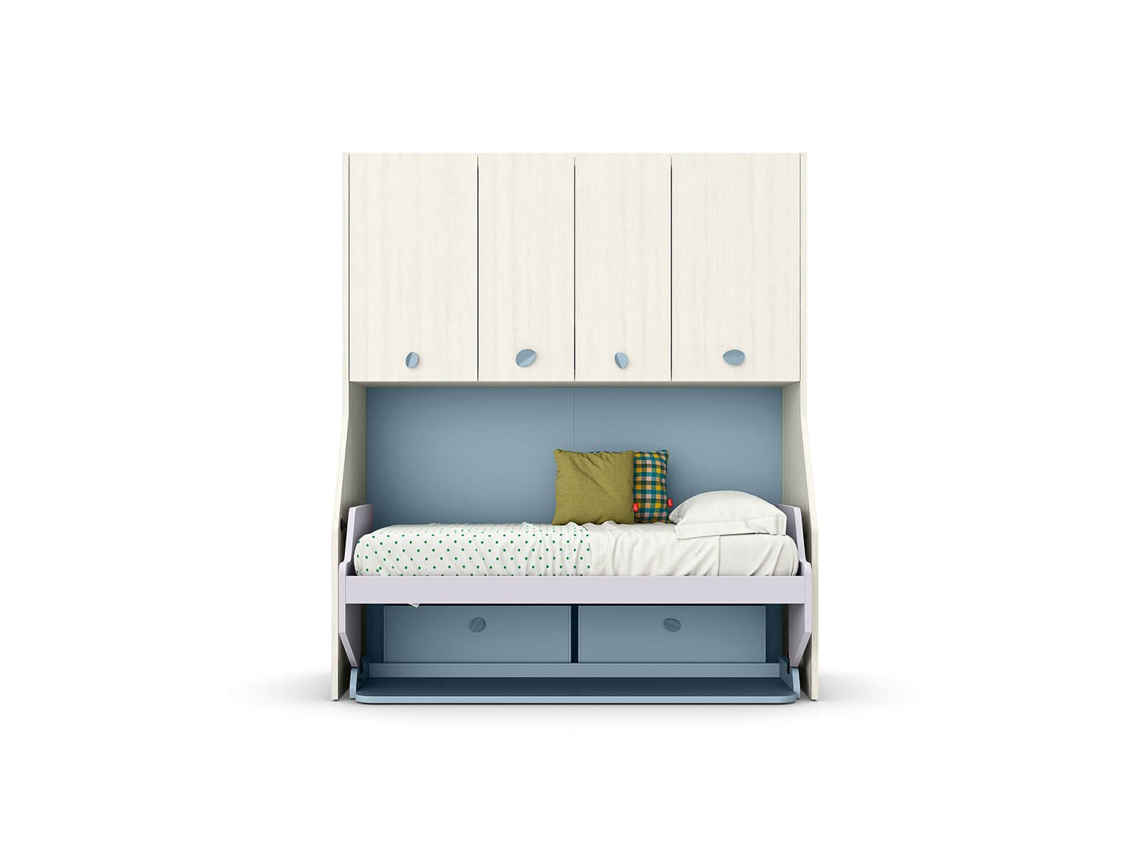 Con i suoi fianchi sagomati più larghi alla base, il ponte Tippy accoglie un letto, uno scrittoio o entrambi. E grazie al meccanismo, lo scrittoio lascia spazio al secondo letto senza dover spostare nulla.