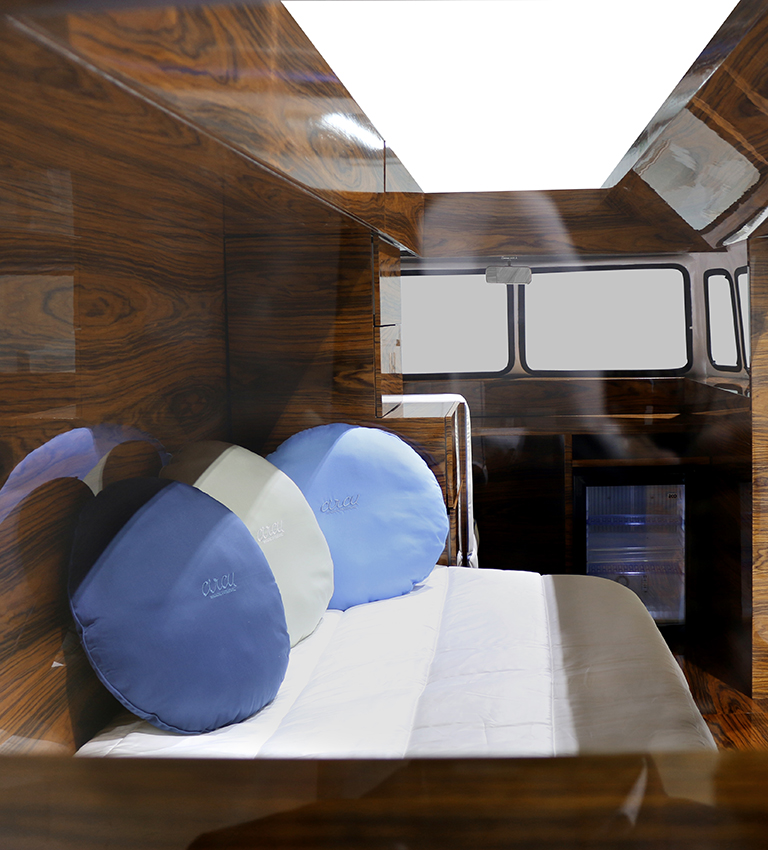 The exterior is produced in fiberglass with chrome-plated finishes and the inside is made of palisander wood veneer, containing several storage compartments, a bed, a TV, desk, mini bar and a sofa.