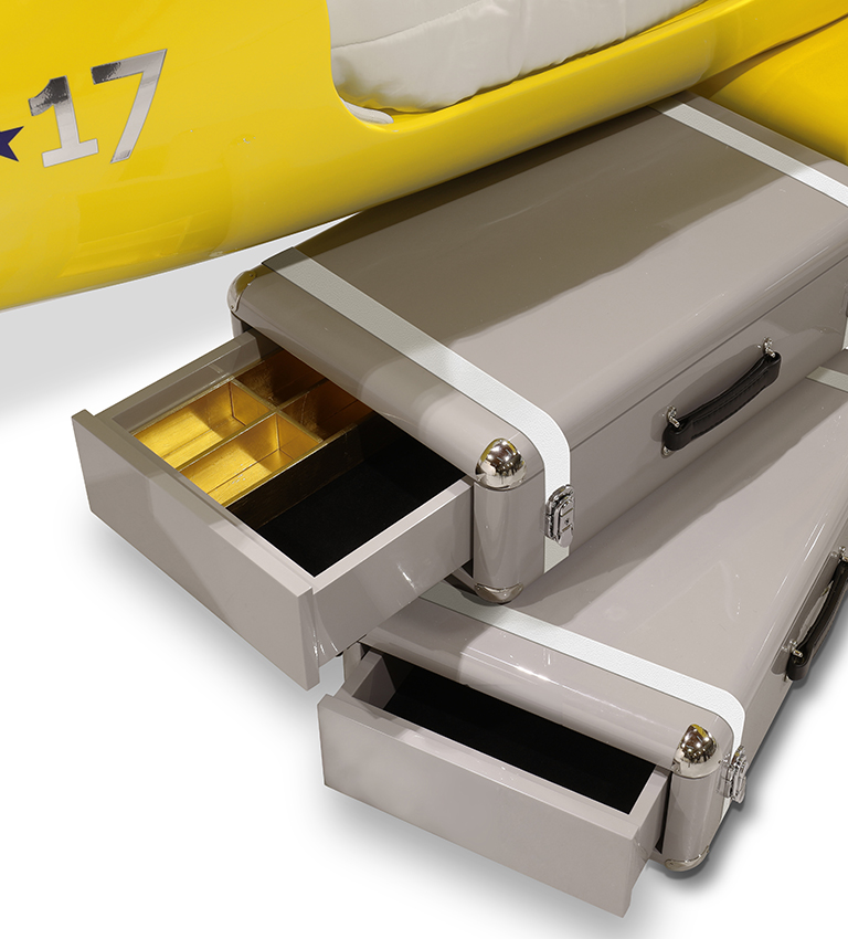 The decorative suitcases include secret storage compartments and allow an easy access to the bed.