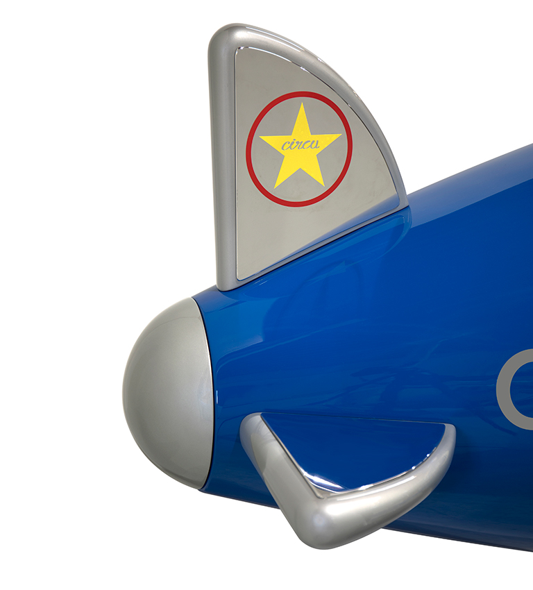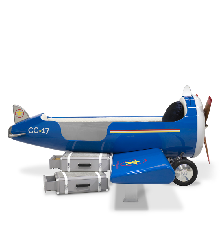 The body is entirely made of fiberglass with glossy varnish applied and chrome plated finishes in the engine and wheels. The decorative suitcases include secret storage compartments and allow an easy access to the bed. The Sky One Plane makes the crib-to-bed transition as painless as possible.