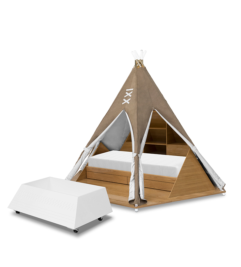 The Teepee Room has a RGB light and speakers and it can be controlled by a mobile app (or with remote control). That connects by bluetooth and you can choose the music you want to play in your smartphone. The app has also a sleep assistant and you can choose the color intensity of the light and lighting effects.