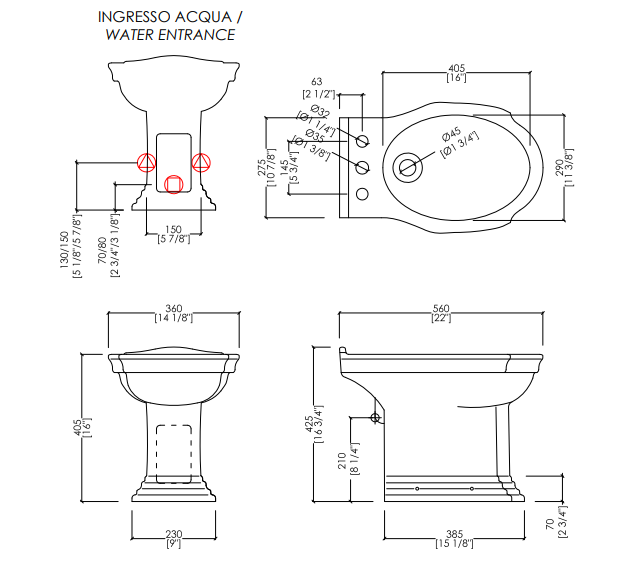 The quintessence of classicism for a bidet with external irrigation and 1 or 3 holes in fine white procelain, inspired by the purest British style.