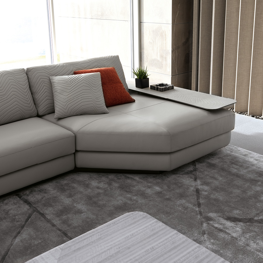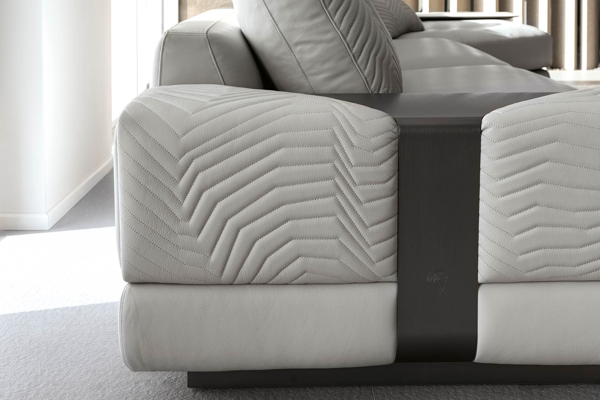 Moonlight modular sofa available in first grade leather, nubuk leather, lizard printed leather, velvet or suede fabric. Sofa seats and sides with special stitching in polyurethane foam wrapped in down feather. Quilted back and armrest. Metal band in the armrest with lasered Giorgio Collection logo. Base and band in satin grey nickel stainless steel.